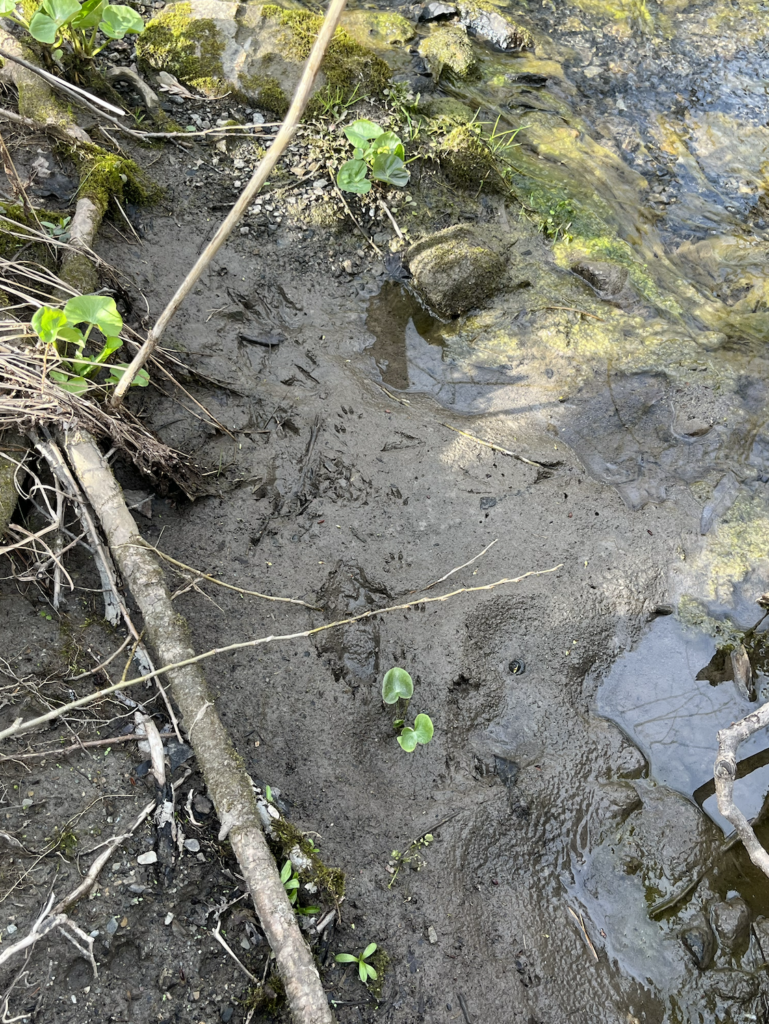 And finally here is a very green little stream we found, along with some raccoon tracks right along the side of it in the mud! I’ve read about racoons washing their hands like humans in water, so I imagine that’s what it was doing.
