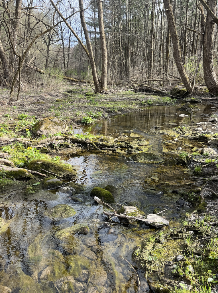 In the northern side of Trinity Woods, there is a steep slope down with a small stream at its base. The stream flows from west to east, and occasionally splits and rejoins. It has a slow flow, is very clear, shallow, filled with small rocks, and littered with organic matter. The soil and dead tree trunks around the stream and bottom of the slope are moist, and home to FROGS.