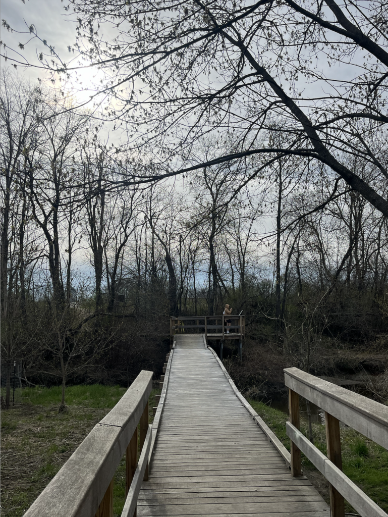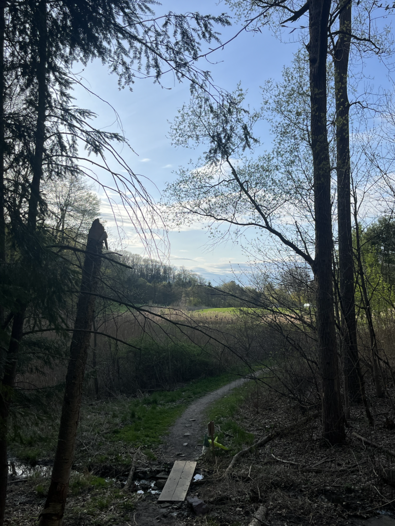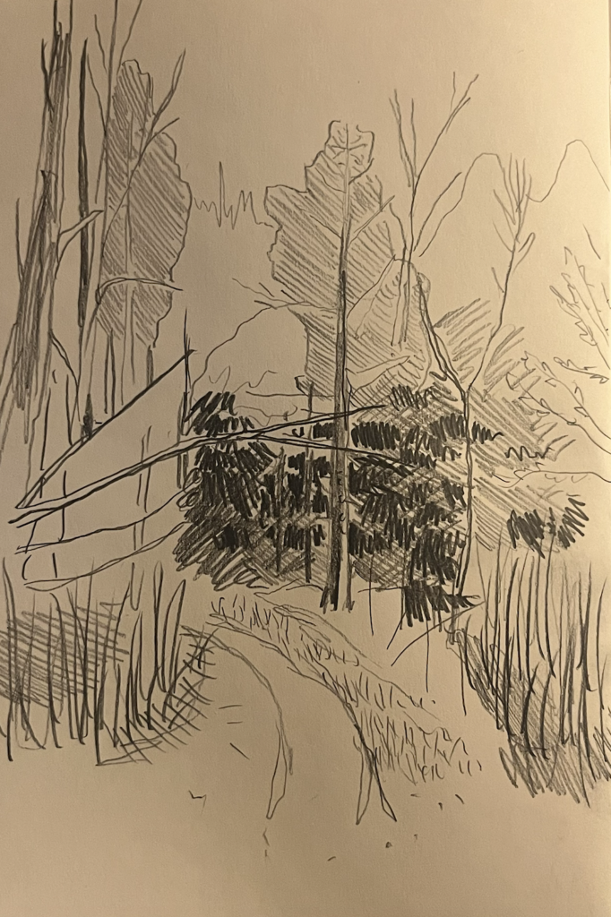 Here’s the sketch I did of the very end of the woods! I had never walked to this part, but the other side of it looked very pretty in the sun. It”s nice to see the different ways students interact with the forest here, especially with it being so close to the dorms on trinity. There were some wooden boards along a stream right down the path in this picture, with a little whiteboard nearby that people had written on. The trail is fairly well traveled, and I can tell that people must walk throughout these woods often on their free time. Despite all this, the woods are very clean!