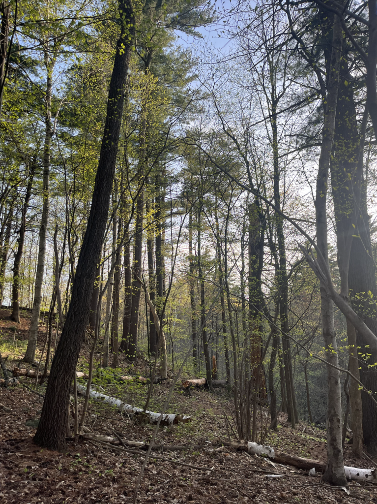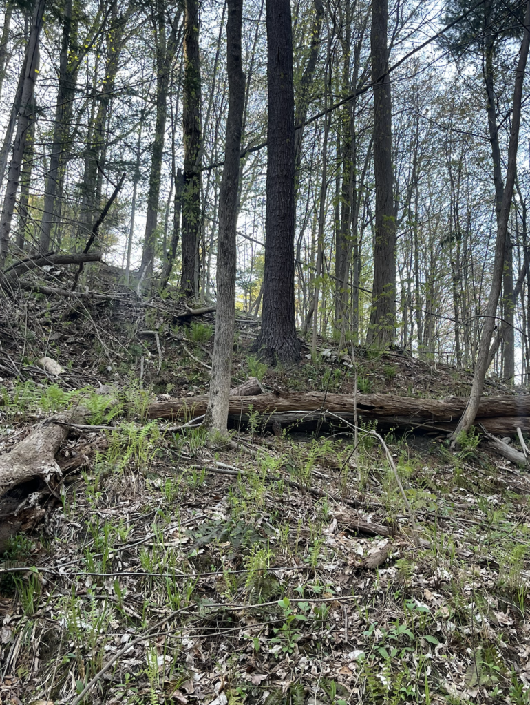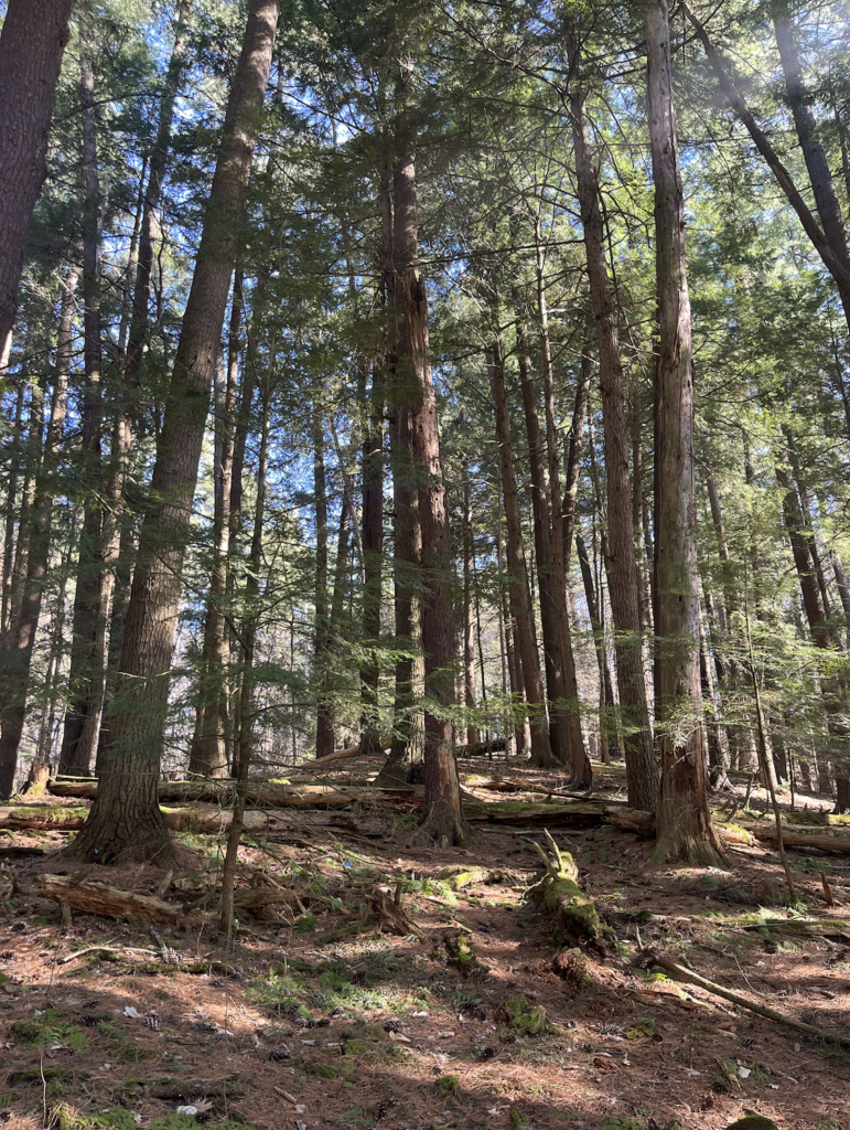 The overstory in Trinity Woods is mainly composed of large eastern white pines, paper birches, yellow birches, multiple maple varieties, and some scattered black cherries. The understory trees are largely small american beeches and sugar maples, and ground cover is limited but includes large ferns, fungi, moss, and some small herbaceous plants.