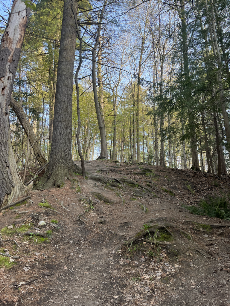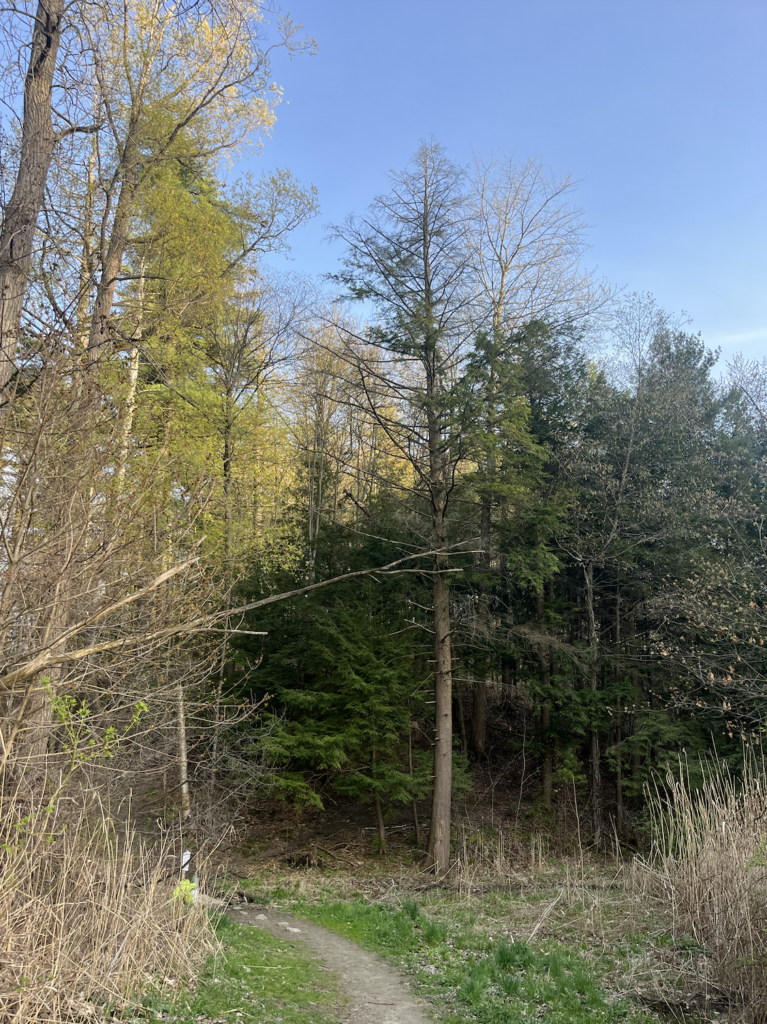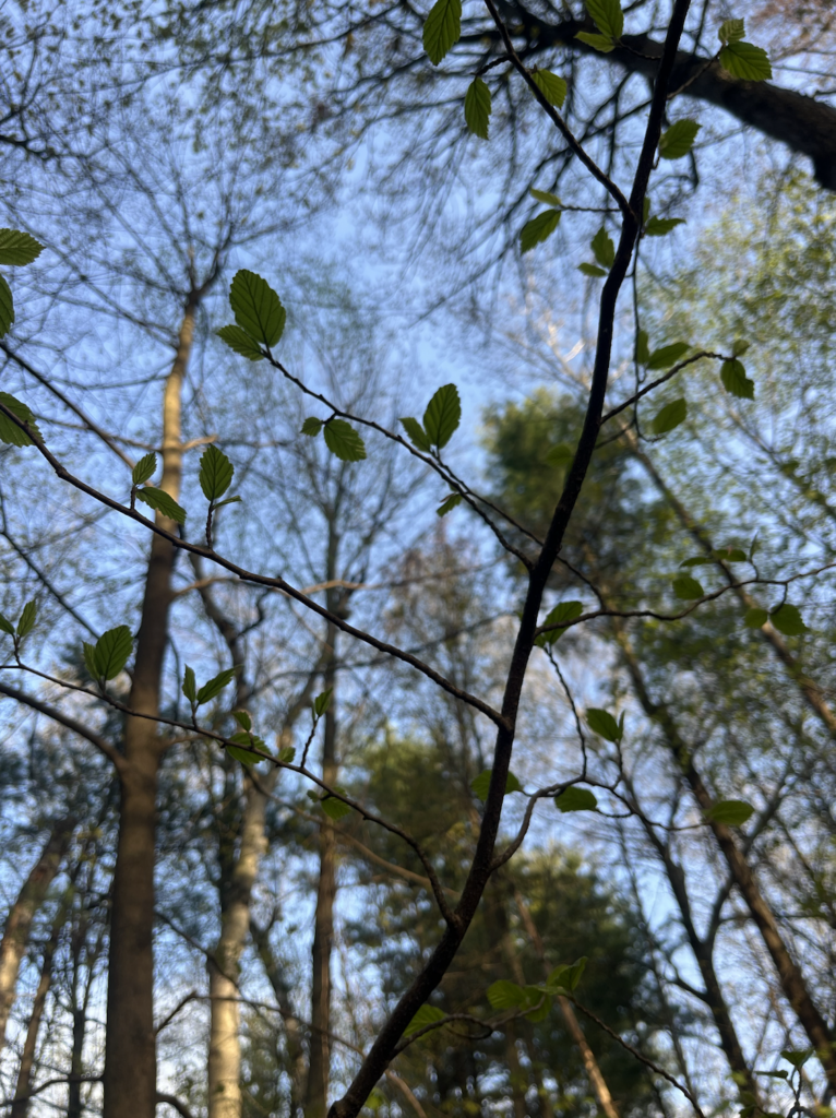 I went back to trinity for the last time of this school year! Things are finally green, and the few buds I found last visit have multiplied and opened and almost every tree has leaves. I went right as the sun started to get lower, and everything in the light was vibrant and light green. It was very quiet when I went, and the only sounds I could hear were the rustling of squirrels in the dry leaves, frogs calling to each other in the nearby pond, and birds above me in the trees.