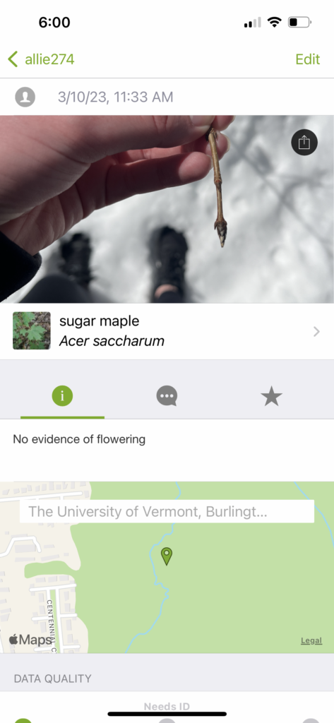 So, I made a mistake. I had looked at the images of the different types buds before I went out into Centennial Woods and I thought that I had a good bud that was on a young Northern Red Oak. I thought that the bark looked similar and so did the shape of the bud. I went home shortly after I went out in Centennial and when I went to work on this post I realized that I was wrong. This is likely the bud of a sugar maple tree. I plan to go out in Centennial when I get back to Burlington and find a proper tree to chronical.