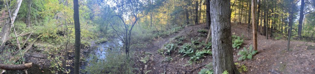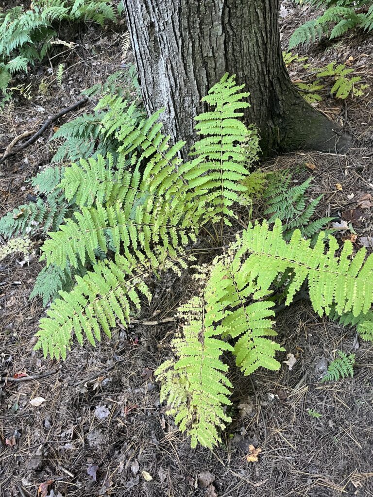 In my location there are multiple small eastern hemlock trees and some buckthorn along. A majority of the canopy trees are eastern hemlock trees. Due to the dominant species of tree in this general area being eastern hemlocks, I am guessing that the soil must be a moist loamy soil. Another dominant species is the fern, like the one pictured above, near the base of some of the bigger canopy trees and covering the slope down to the stream.