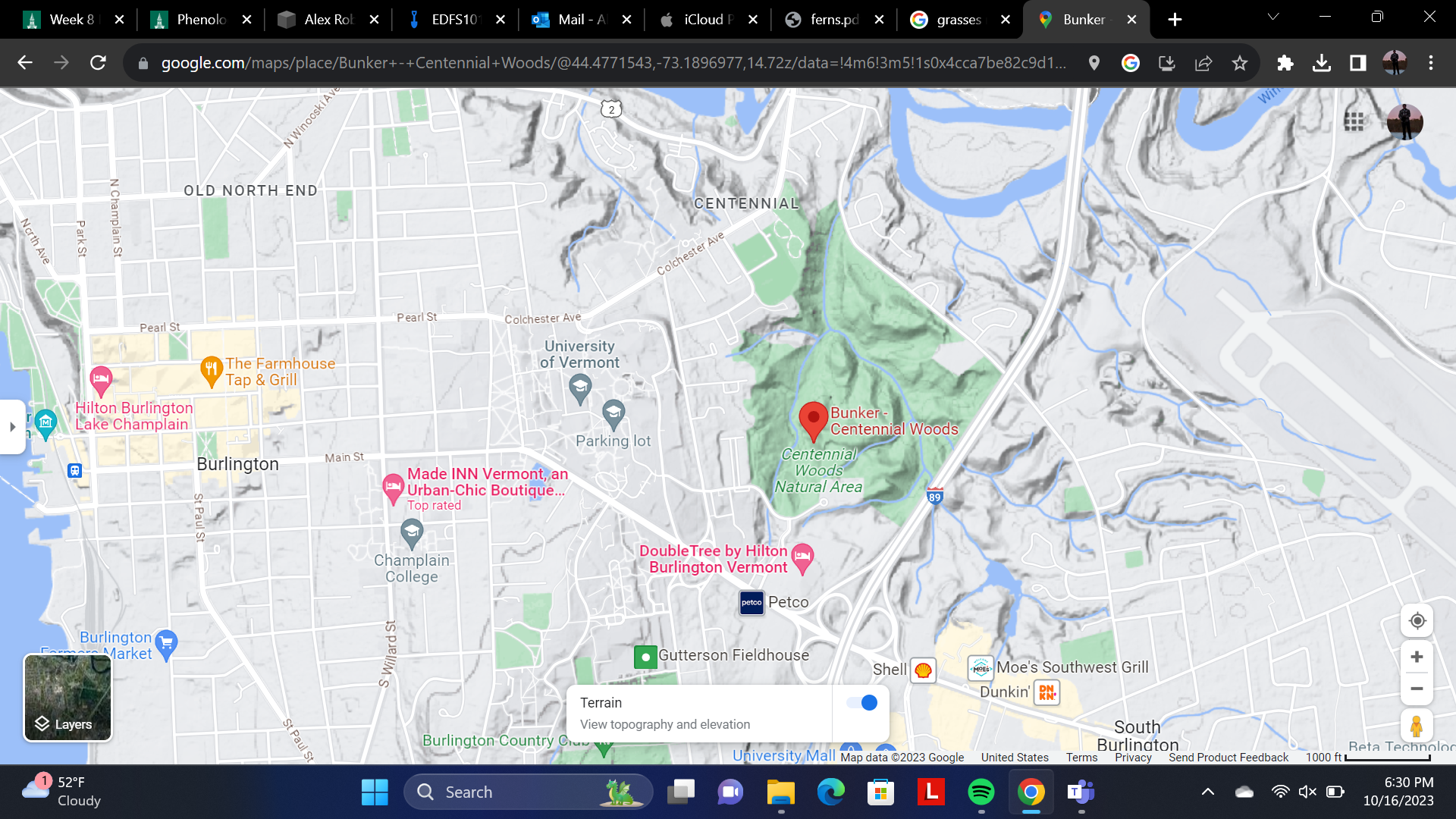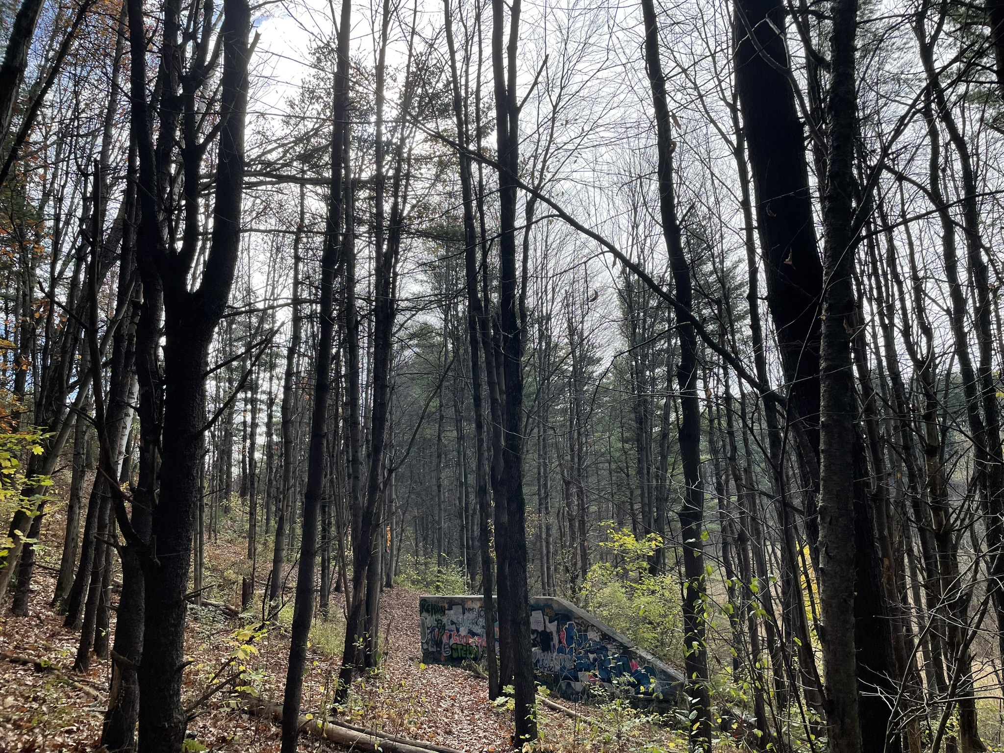 Post-peak foliage in my site has opened up the tree line and allows me to be able to see towards the trails to the Southwest. The above image (taken 11/6/2023) shows my site from the Northwest direction. I was originally drawn to this site because of this structure, and the Autumn foliage has given it a different kind of contrast with the surrounding environment. Most of the Paper Birch and Sugar Maples have lost almost all of their leaves already, with the Norway Maples still holding on and giving the area a nice last piece of bright green. The Eastern White Pines and Hemlocks still have all of their leaves and continue to keep the overstory green. On the ground, many small plants have withered to stems, with the exception of most of the ferns.