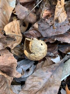 I also spotted a few creatures or signs of them at my new phenology spot! There was some white-tailed deer scat (Odocoileus virginianus) and I also spotted a gray squirrel (Sciurus carolinensis), but I unfortunately did not manage to get a photo of it. There was also one tree that was noticeably scraped up, and I believe that it is from a white-tailed deer who was likely either trying to mark their territory and keep another buck away from their home, as it is not antler shedding season for white-tailed deer yet. Throughout my time at my phenology spot on one of the days I visited it (11/22/2022), there was constant noise from many common grackles (Quiscalus quiscula), although I never actually saw any of them. In my opinion, common grackles have a very distinct call. I am very familiar with these birds as I have grown up around them. Several of my neighbors farm, and I would often hear them express their anger towards the grackles that frequently ate their corn. The final sign of animal life that I stumbled across during my time at my spot was a few decaying spongy oak apple galls. These are produced by gall wasps (Amphibolips confluenta) on scarlet, red, and black oaks. This makes sense considering there were a few towering red oaks in my phenology spot.