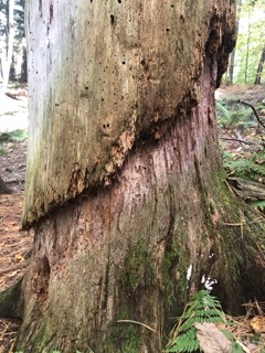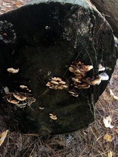 After bringing some friends on a nice weekend walk with me to visit the burrow again, I took a closer look at the moss-ridden logs at my feet. It was common to see fungi sprouting out of the ends, and see chips of the wet and rotting parts of these logs falling off. In fact, much of the pines in this area of the forest reflected this image: all seemed to be dying to a degree. The trees around here are large in size, but their bark is chipping or raked completely clean, leaving behind what I think the culprit might be, termites.