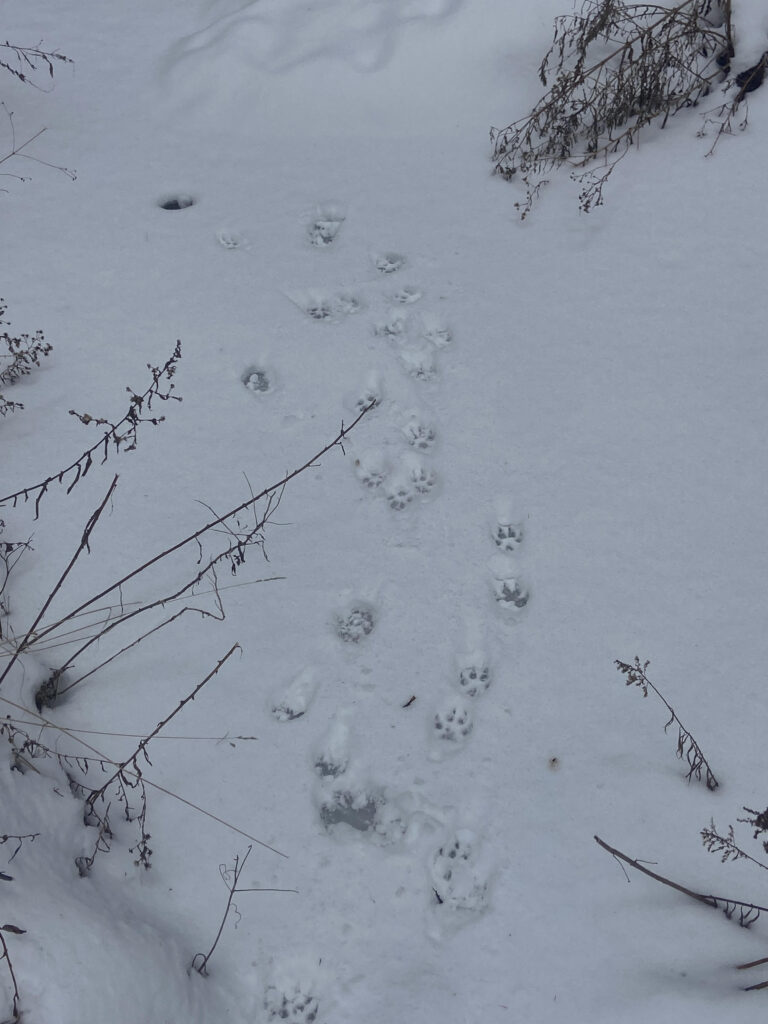 As I come closer to my spot, I observe some animal tracks on top of the riverbed. I gaze at the defined prints and think… what happened here? What type of animal decided it would be a good idea to risk falling into the ice? I inspect carefully, my mind pondering different ideas… Raccoon? No, too defined and the shape of nails remain. A fox? Hmmm, that would make more sense. In order to let these thoughts flow I begin to write. A story erupts from this image and the earth speaks to me….