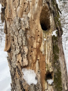 In a different location, I noticed some holes in a tree. I believe this is signs of a woodpecker.