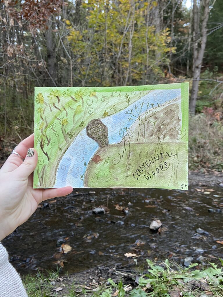 In November (2023), I was challenged to trek out to Centennial. Suffering from mental health issues and being away from home didn’t stop me from going out and seeking some alone in the forest. I decided to sit down and paint, with the gentle stream sending whispers into my ear. I recall documenting how the leaves were shedding into the understory, and the sight of green was beginning to dwindle. Winter was coming, yet the forest eased into this seasonal change.