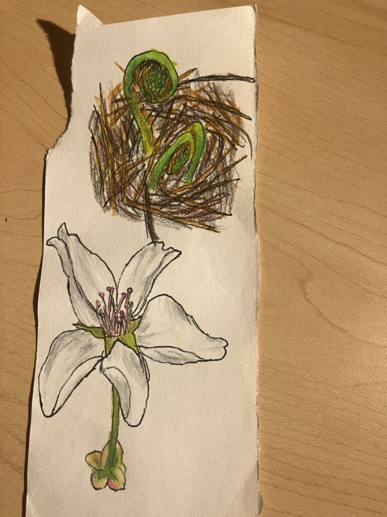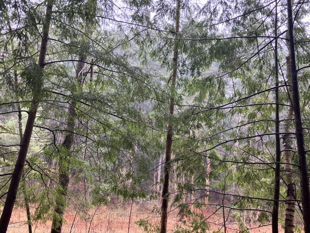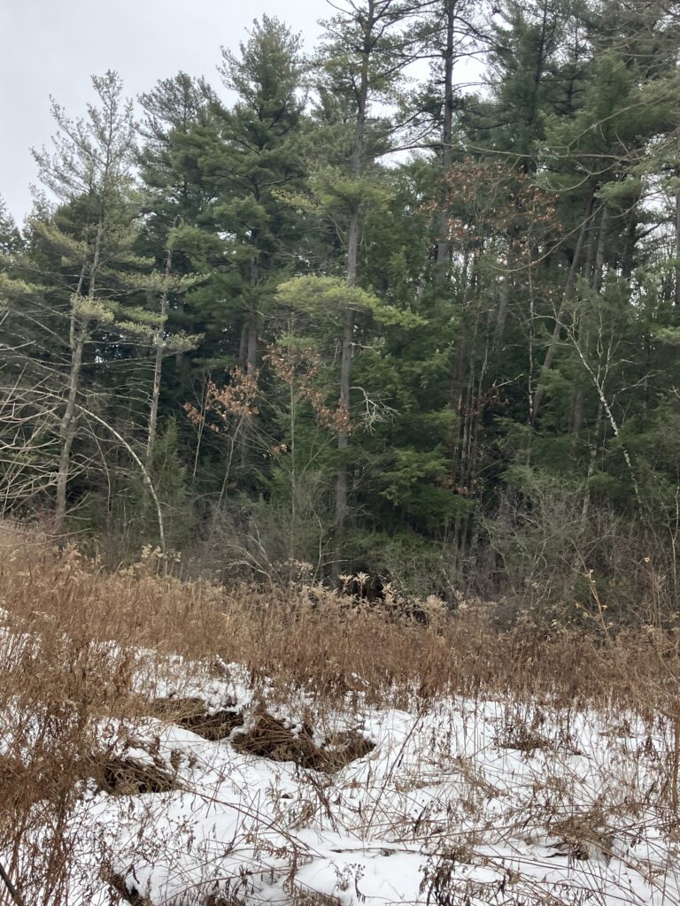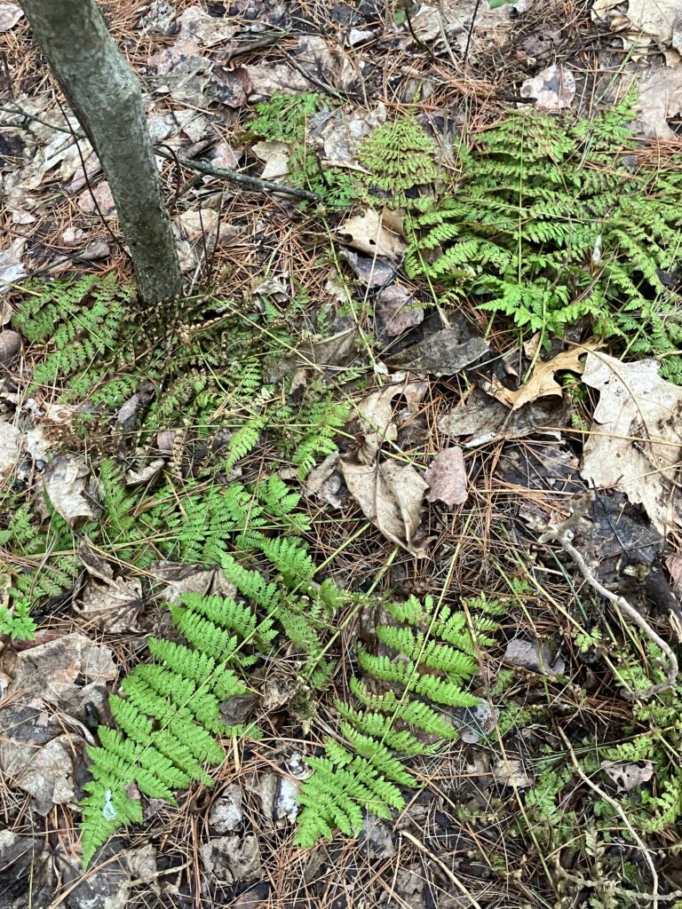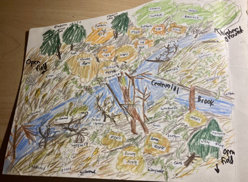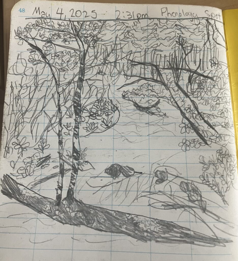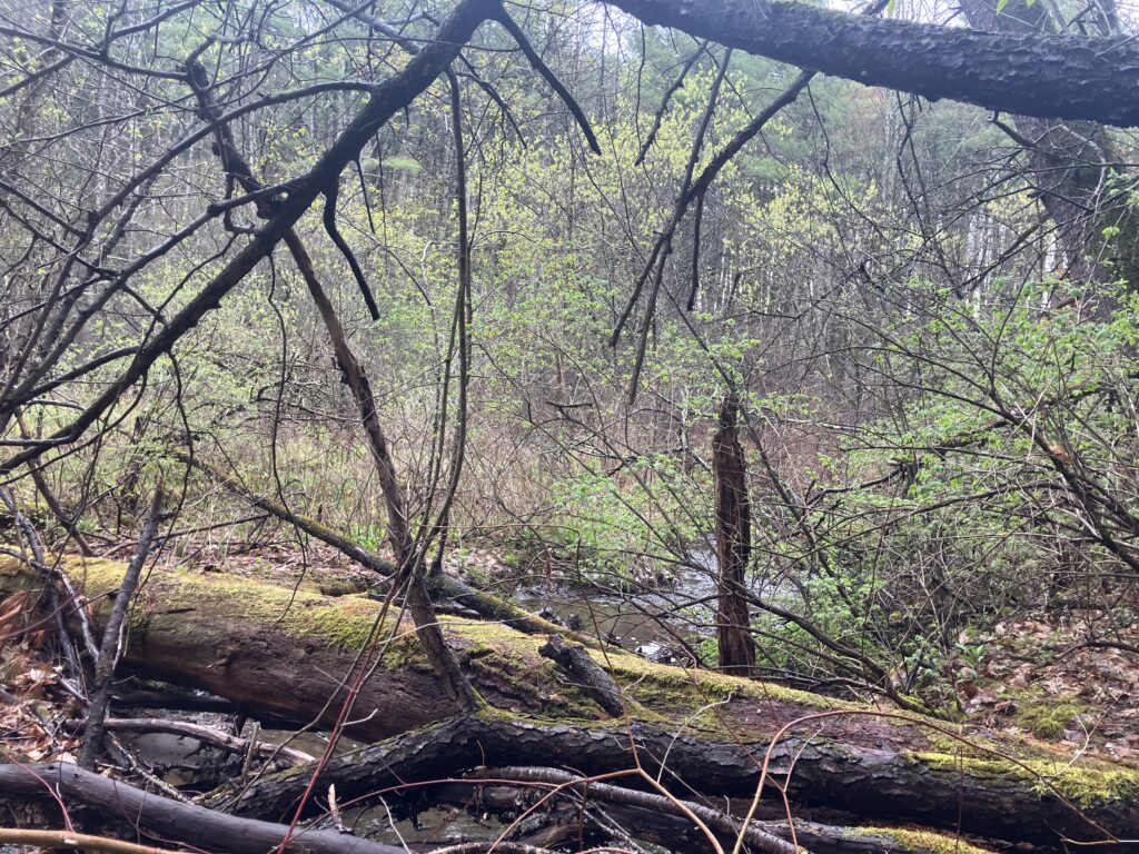Today, for example, I noticed vegetation I had observed and recorded on my first visit back in early October just beginning to bud and come to life. The species diversity that I could observe changed significantly over the seasons and seemed to be at it’s peak during this last visit. Back in January, almost all the vegetation was dead or dormant besides the eastern white pines and hemlocks. Brown and white were by far the dominant colors in contrast to the vibrant green I saw today. While there were few wildflowers in my site, I think there were more species of plants popping up then I saw on my first visit. The brook has also changed drastically depending on the season; going from barely flowing to frozen and snowed over to the strong current it had today. My visits since December were silent aside from an occasional bird and I mostly experienced wildlife through their tracks. Today I didn’t have to look very hard to see fish, frogs, and squirrels. In my spot I saw a pine warbler and heard a brown creeper, pileated woodpecker, and white-breasted nuthatch, identified with the help of the Merlin app. All on my short walk out of the woods, I saw chickadees, more warblers, and a northern cardinal and heard rather loud great crested flycatcher.