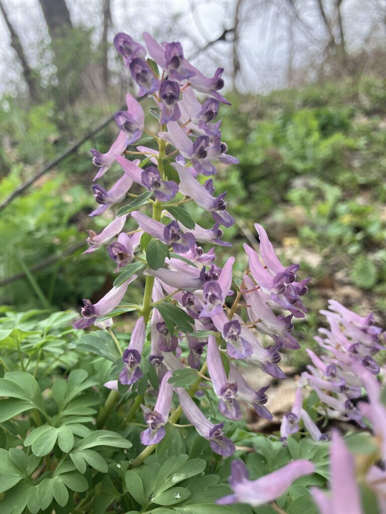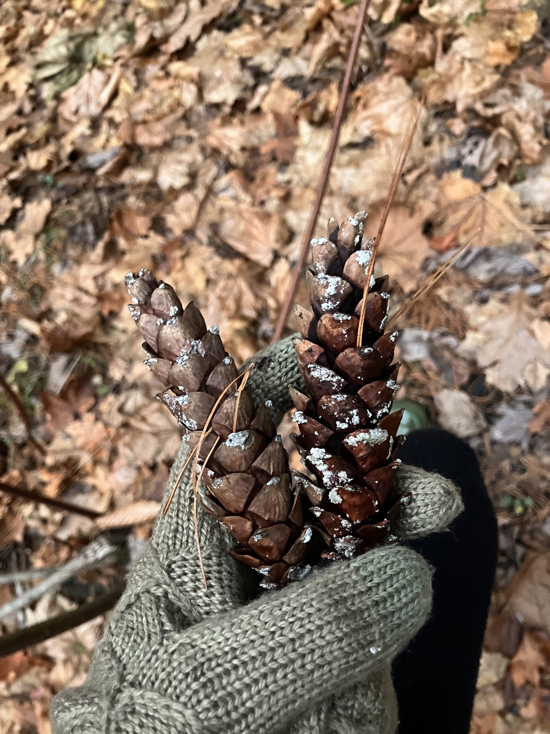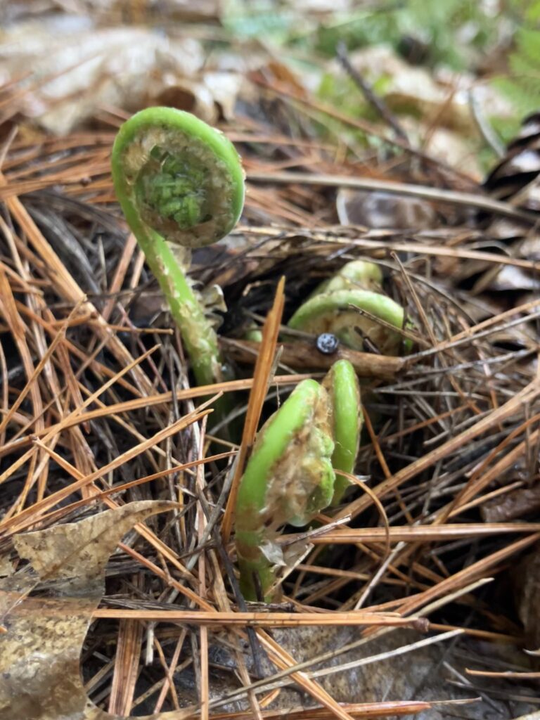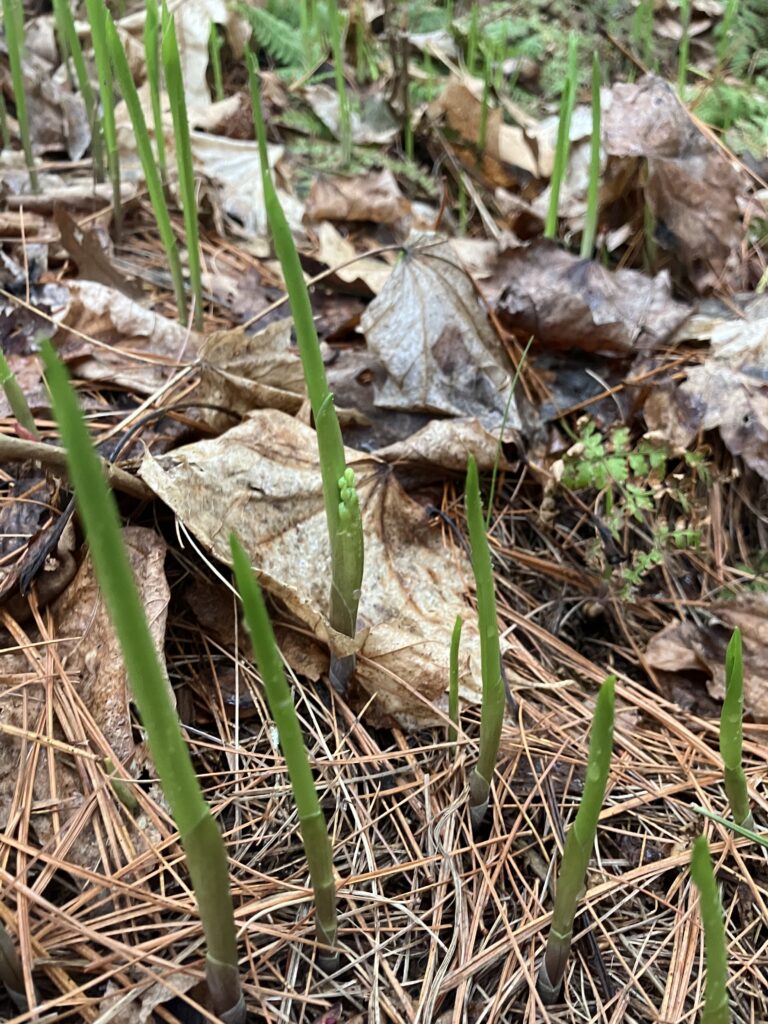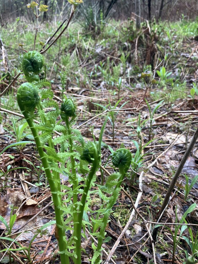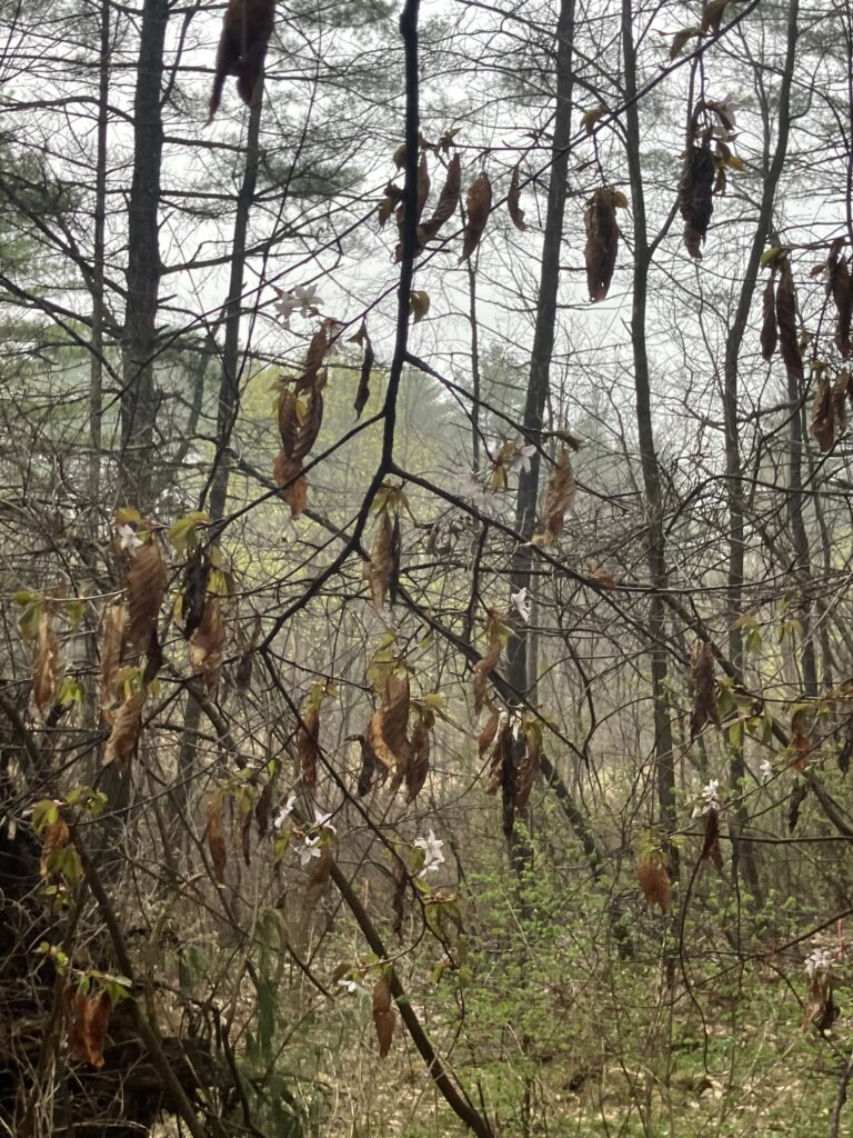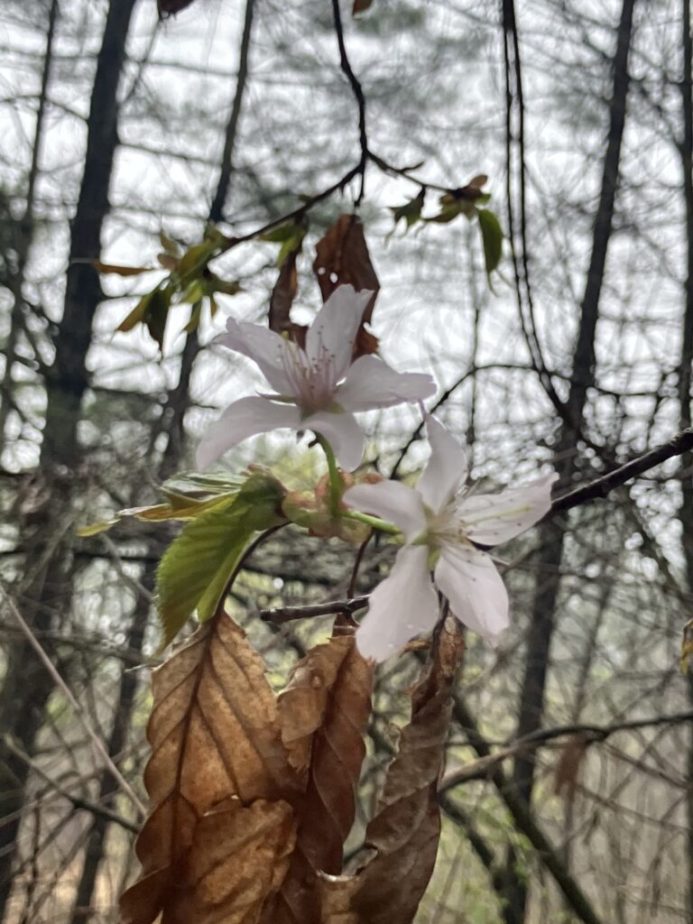 Today, for example, I noticed vegetation I had observed and recorded on my first visit back in early October just beginning to bud and come to life. The species diversity that I could observe changed significantly over the seasons and seemed to be at it’s peak during this last visit. Back in January, almost all the vegetation was dead or dormant besides the eastern white pines and hemlocks. Brown and white were by far the dominant colors in contrast to the vibrant green I saw today. While there were few wildflowers in my site, I think there were more species of plants popping up then I saw on my first visit. The brook has also changed drastically depending on the season; going from barely flowing to frozen and snowed over to the strong current it had today. My visits since December were silent aside from an occasional bird and I mostly experienced wildlife through their tracks. Today I didn’t have to look very hard to see fish, frogs, and squirrels. In my spot I saw a pine warbler and heard a brown creeper, pileated woodpecker, and white-breasted nuthatch, identified with the help of the Merlin app. All on my short walk out of the woods, I saw chickadees, more warblers, and a northern cardinal and heard rather loud great crested flycatcher.