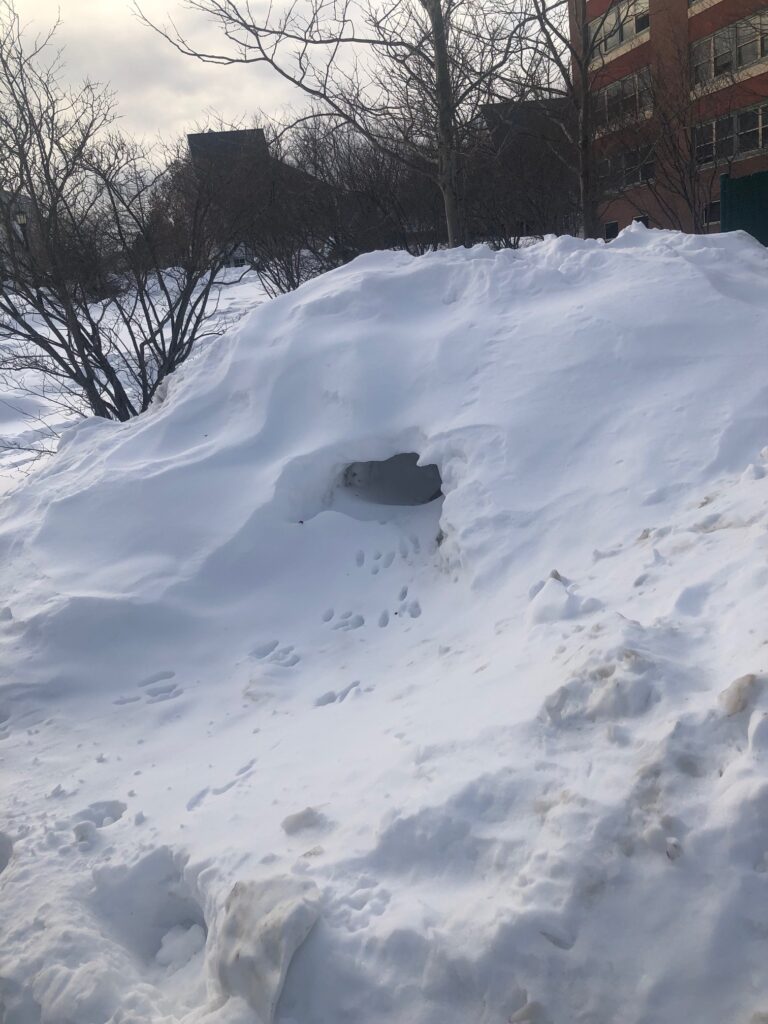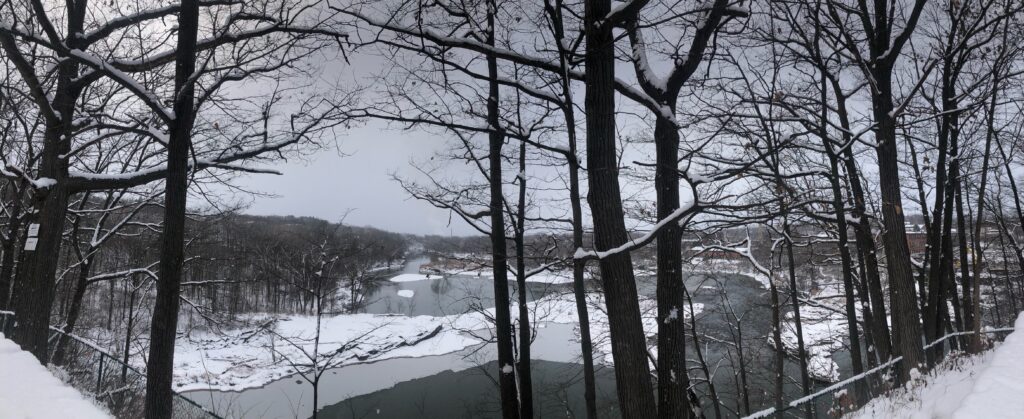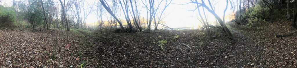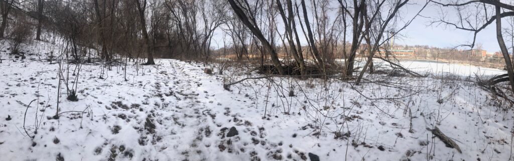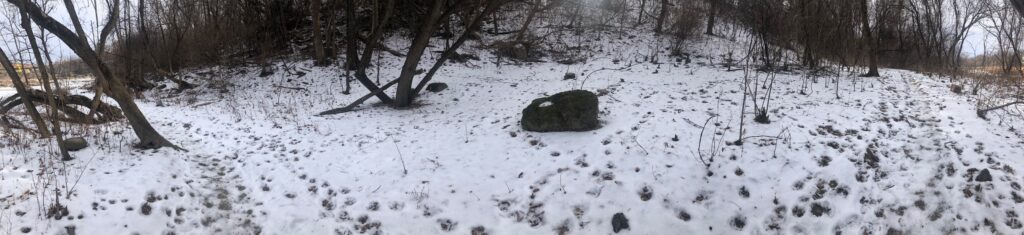 I’ve noticed many signs of human life here throughout my visits– from footprints and dog paw prints to trails and tents. There is also a lot of intervention with the river nearby since the dam can be seen from my site. In this way, I think that humans and our culture interact with this place through many different ways and for many different reasons–from people walking dogs, to those needing a safe place to sleep, to those looking to use the river for its energy potential. Lastly, some people come here just to be part of it. All of these people leave signs of themselves and, in doing so, contribute to the atmosphere here.