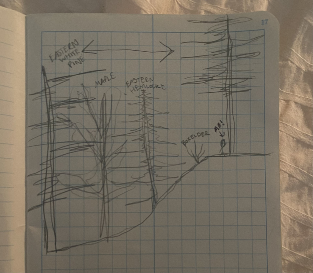 This spot is accessible to me as a student of UVM. It is near campus and I envision myself walking out there (hopefully) once a week. Also, this spot contains an expansive diversity of vegetation, especially of native trees we have learned about. I am excited to observe the ecological changes the seasons bring (phenology) and can’t wait to share my observations. 🙂