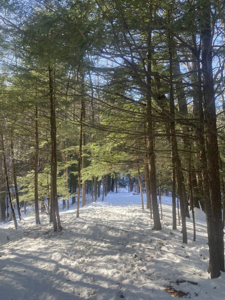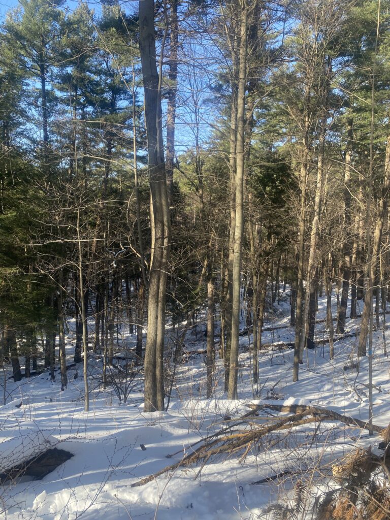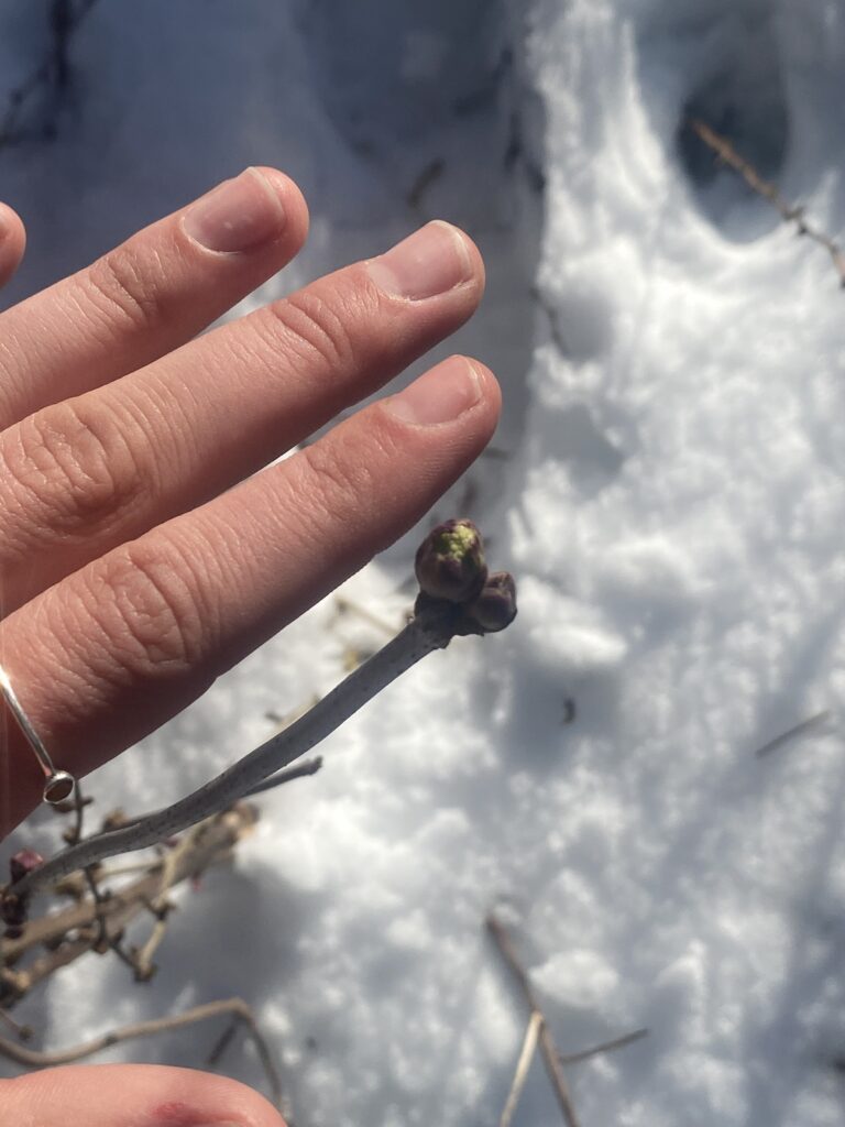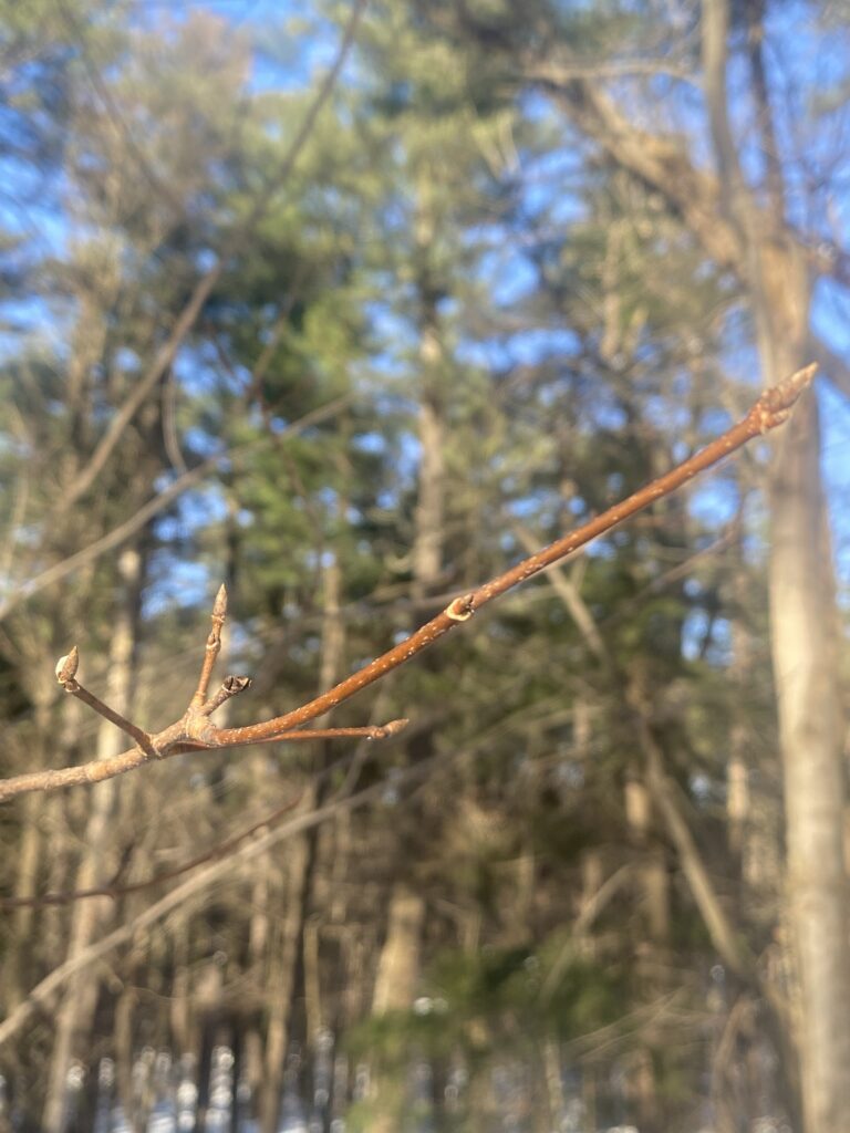 Today I went back to my phenology spot to observe signs of spring. Despite the solid 7 inches of snow still on the ground, there were many phenological signs of spring to explore! This included buds swelling, some even showing new, green buds, along with some more animal activity than usual. I heard more bird calls, and saw track activity of deer and squirrels in the snow. It was somewhat hard to detect because the snow was quite wet and deep, but in shallower parts I was able to see some more defined tracks. I will attach pictures of the buds, and the spring forest.