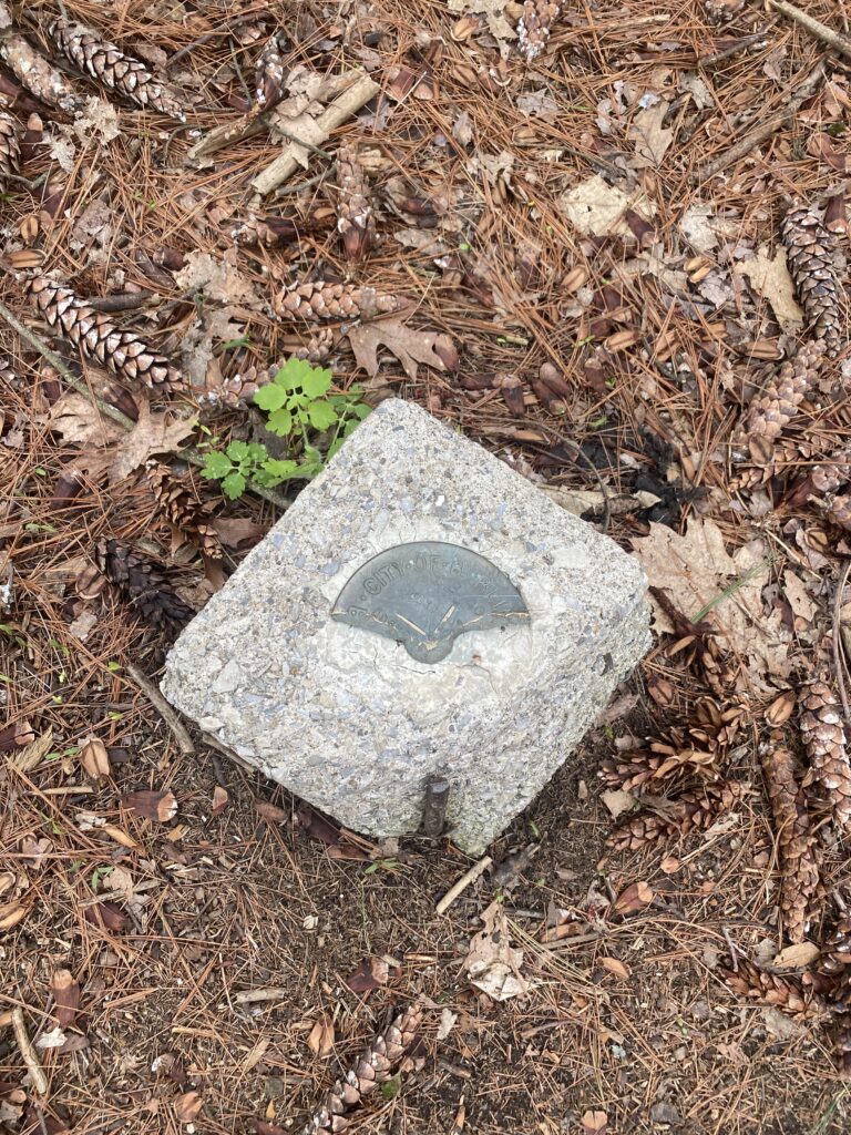 What major/minor landmarks am I now familiar with? The large eastern white pine I sit underneath, a few square feet of metal fencing that was once standing around the tree, a small concrete block that has a half chipped off metal plaque, reading “CITY OF BUR-“. This block signals me to turn onto a different small path to walk to my spot.