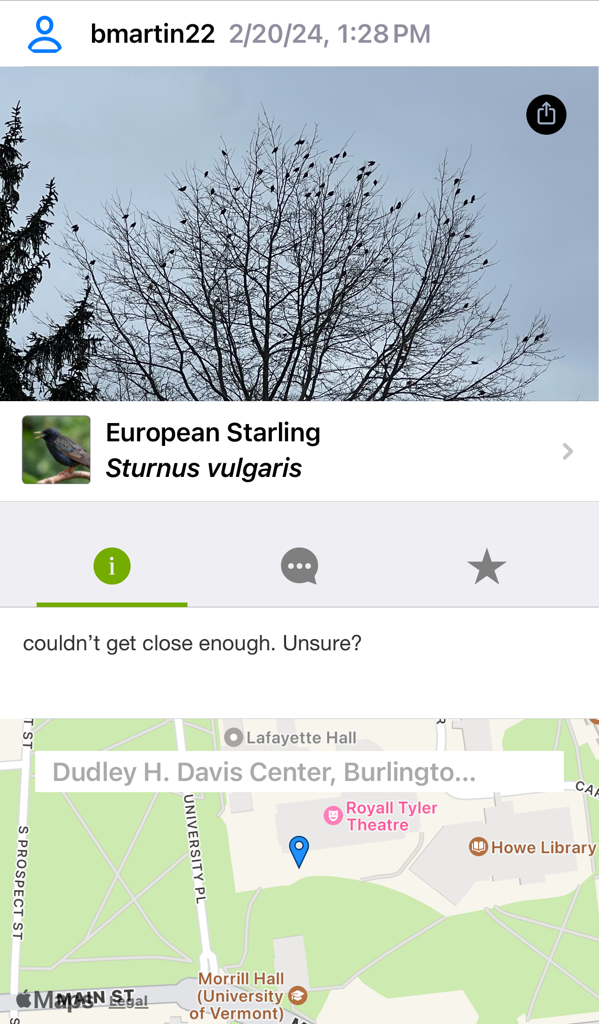 Welcome to Winter. With the Inaturalist app, I was able to track few signs of winter life while walking around our very own campus at the University of Vermont. While I have been pretty sick, finding these pieces of nature on my own definitely pumped some joy through my veins.