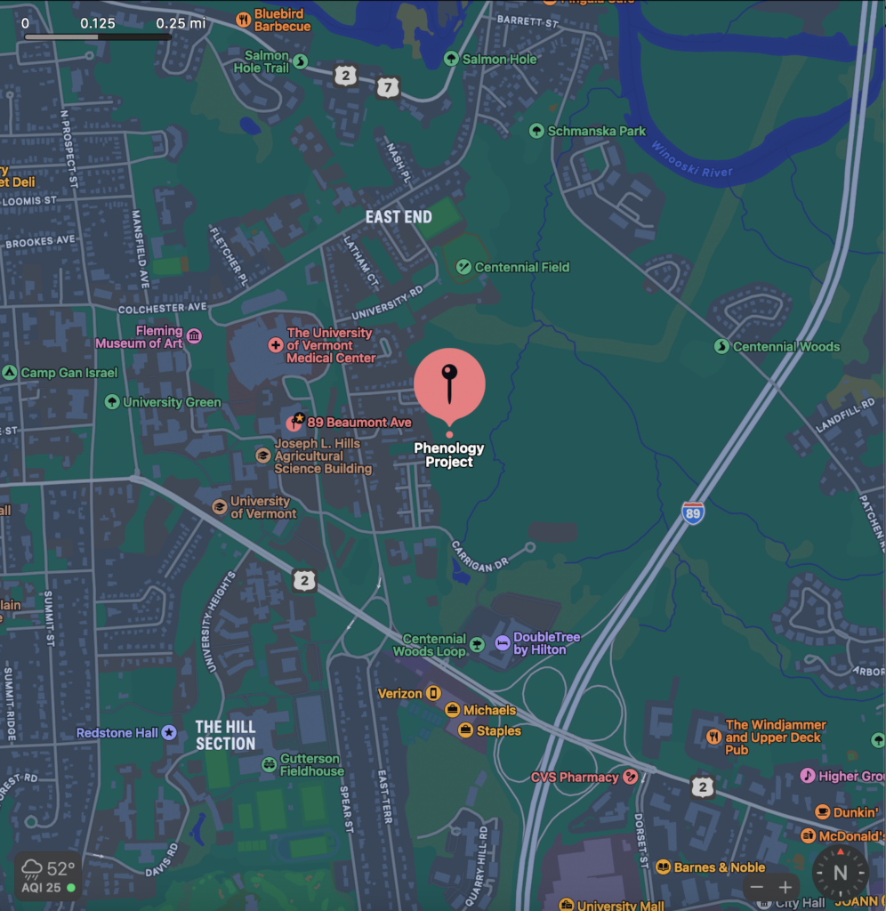 I chose to do my phenology project in the eastern parts of Centennial Woods in between Centennial Courts and the stream flowing through the forest. I chose this spot because it is easily accessible, and has high levels of biodiversity and vegetative density.