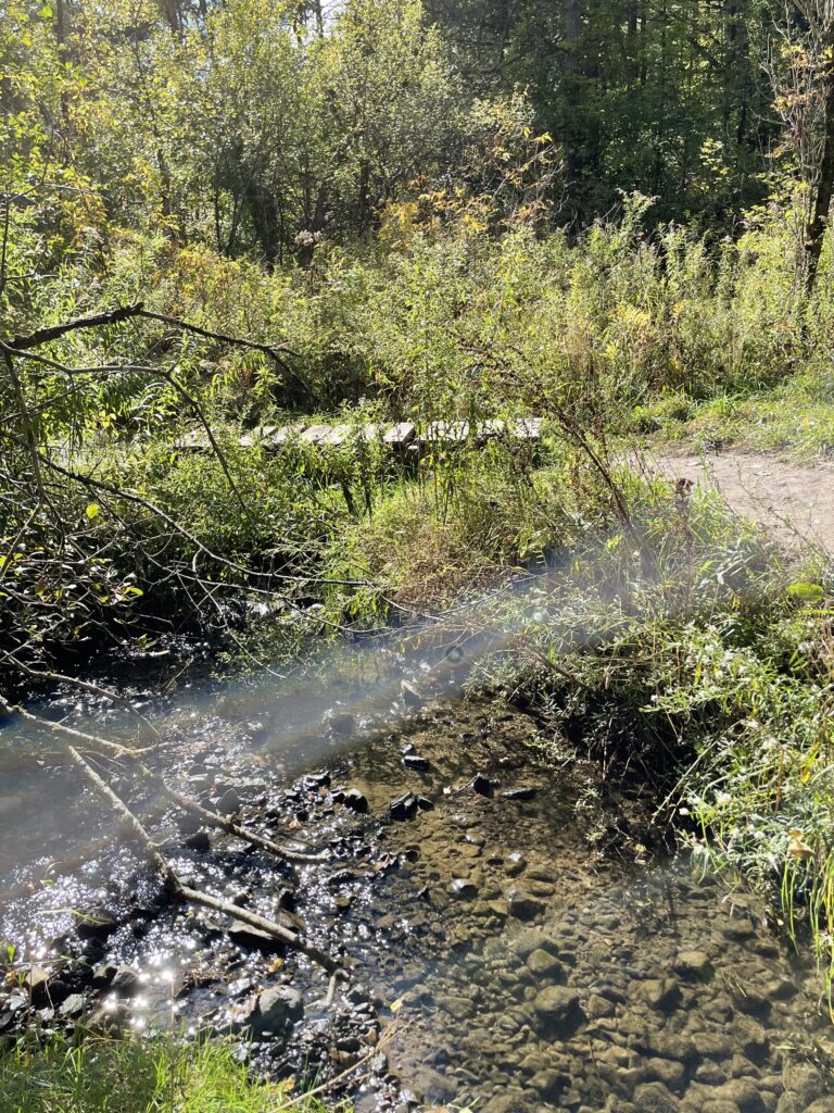 Walking down to the end of Carrigan Drive, you’ll spot a trailhead on the left directly after the Centennial Court Apartments. Turn into the trail and begin walking. The trail will be mainly downhill, and you’ll soon approach a stand of pine trees where the trail splits into two. Keep walking straight following the leftmost path and you will continue on downhill. At the bottom of the hill, you’ll reach a long foot bridge that cuts through a meadow. This indicates that you’re almost at the site. Once you cross this long footbridge, walk a few more steps until you see a wooden bridge that goes over Centennial Brook and you’ve reached my phenology site! I chose this spot by the brook because I loved the sound of the water rushing over the rocks and the surrounding foliage was a beautiful bright yellow. I was also drawn to all the different species of flowers and other plants in the meadow next to the brook and I’m excited to identify all the various types of organisms that call the meadow and brook home.