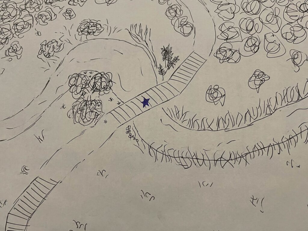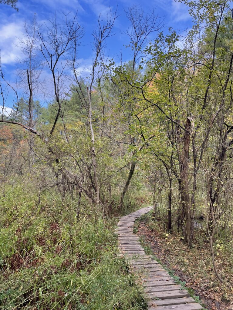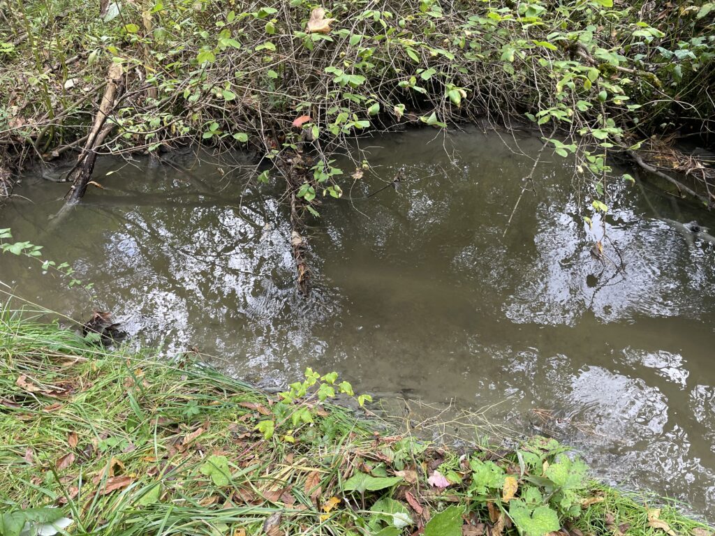 Sitting on the small wooden bridge that stretched across the river, the most prominent sound I could hear was the rushing of the river. There were a few birds chirping and the wind rusting through the trees as well and it was all very peaceful. It smelled like fall as it had just rained before my visit and the leaves on the ground were still a bit wet. It was pretty cloudy out but it was warmer than it had been in the past few days and it was nice to get into the woods even if it was just for a little while. Since my previous visit, there was much less vegetation on the trees and if the leaves hadn’t yet fallen off, the majority of them had at least turned colors. There were much fewer fish and water skeeters in the river since the water was beginning to get quite cold. I also noticed that the water level in the river seemed a lot higher. In addition to the increased water level, the water seemed a lot murkier, possibly due to excess sediments in the water which resulted from erosion after the water levels increased.
