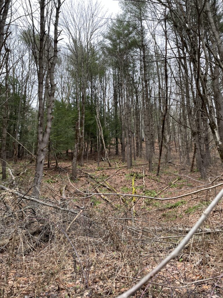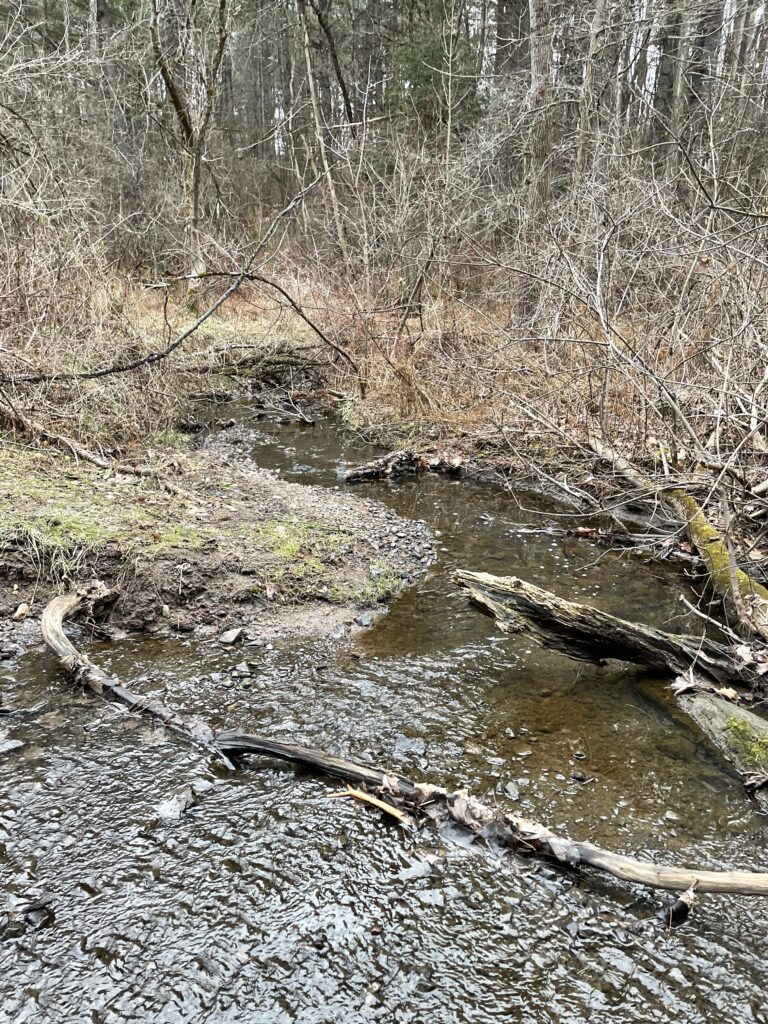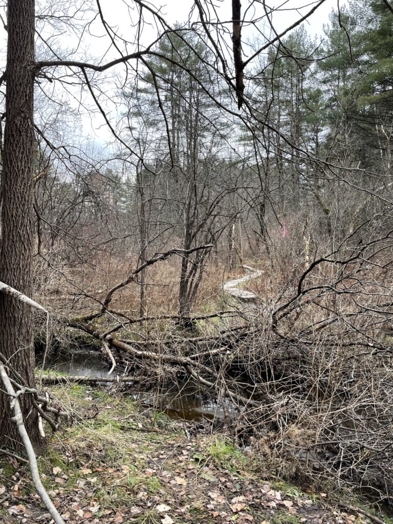 On my final visit to Centennial Woods this semester, the air was cold and it was quite cloudy out. It had just rained and caused the blanket of snow to melt, so unfortunately it was impossible to find any animal tracks in the snow. The rain had caused the water level in Centennial Brook to rise a significant amount, and it was flowing at the fastest rate I have seen throughout the course of my visits. The leaves from all the trees have finally fallen, leaving a barren canopy with only a few areas interspersed by green where Eastern White Pines and other conifers are growing. The space looked a lot more open and I was able to see an area across the river that I’d never seen before since it had previously been blocked by leaves of vines, bushes, and trees. Looking to the down rather than to the canopy, leaves that had fallen and covered the ground were beginning to rot and decompose. There were very few signs of animal life, and the stream was now free of all fish and insects that had been abundant in the water during my previous visits.