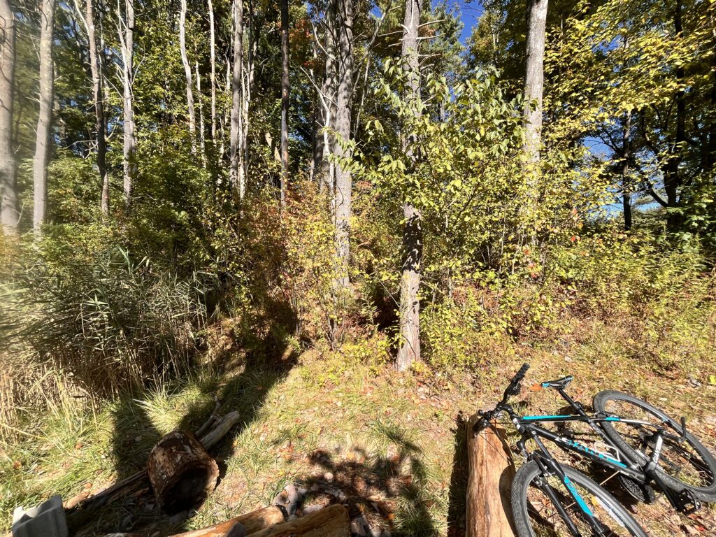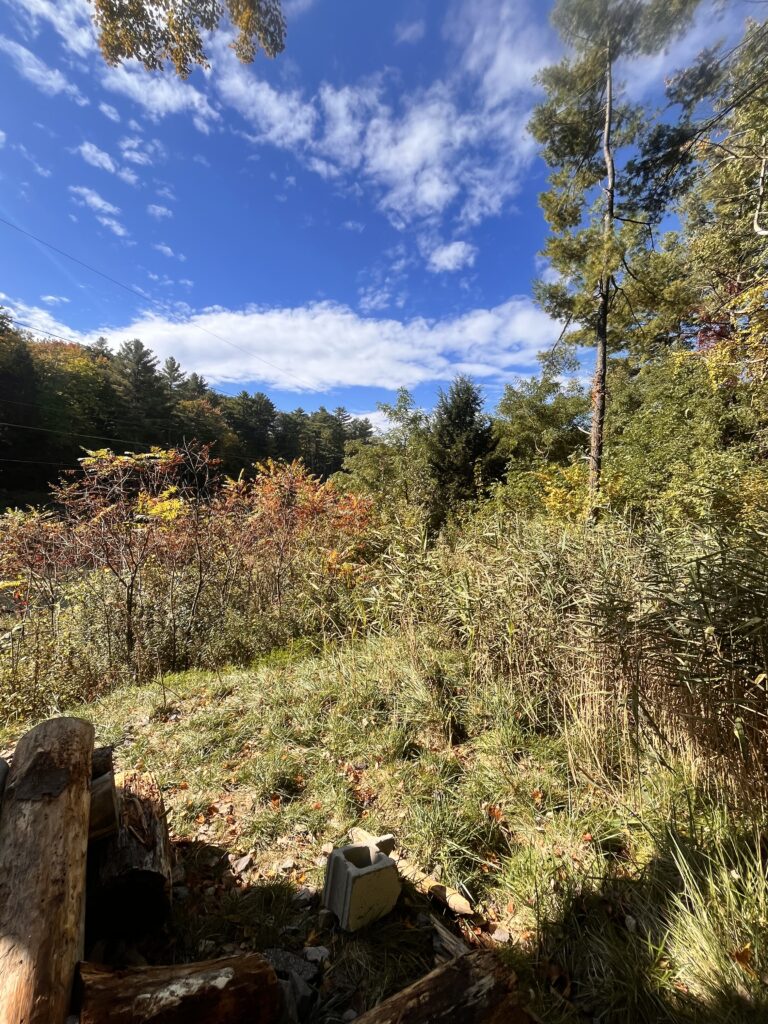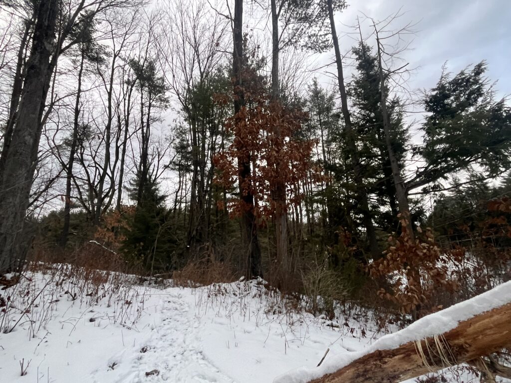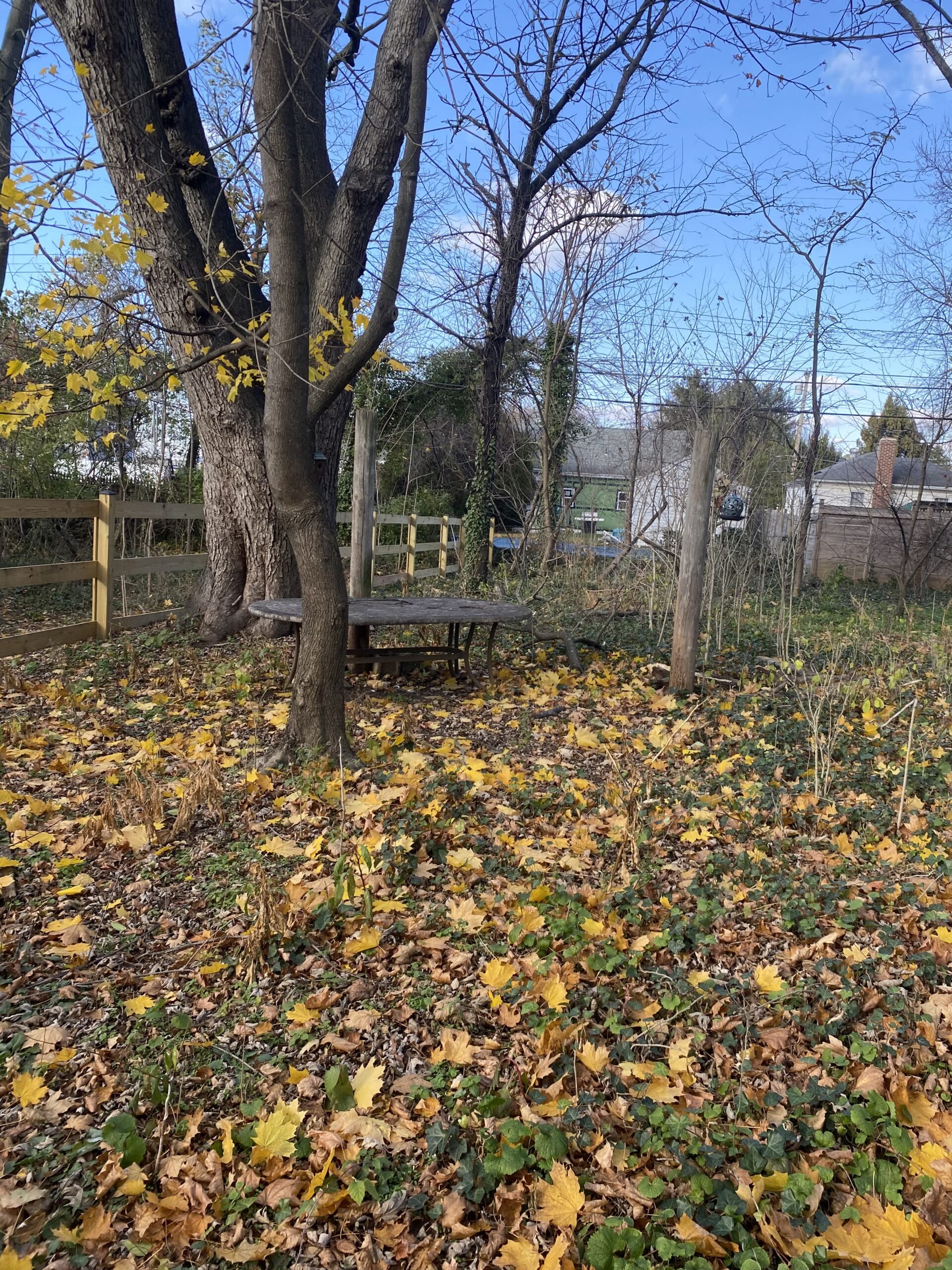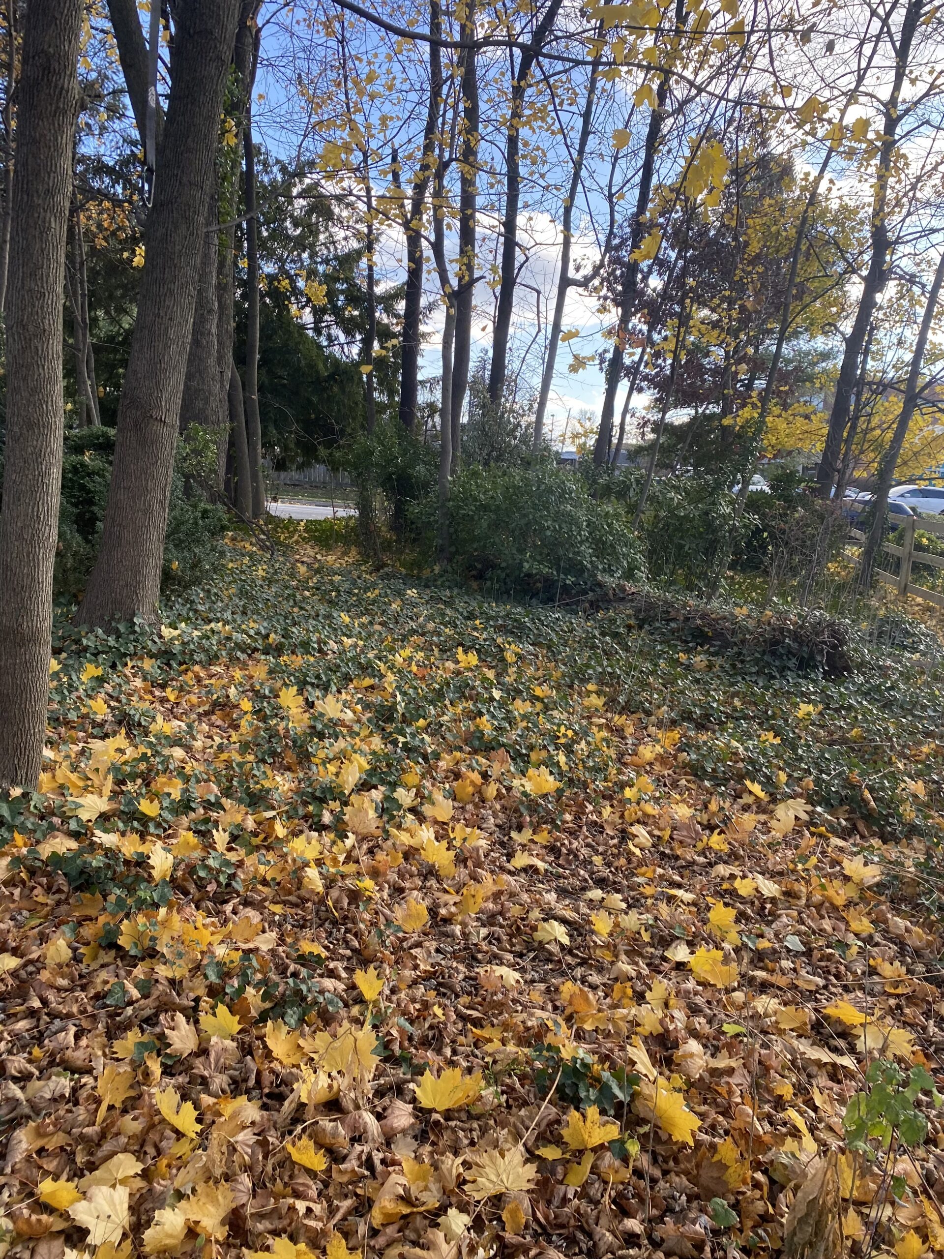 I visited a forested area down the street from my house that was an old lot that got abandoned, the most interesting thing about going to Maryland was feeling like I had gone back in time by three weeks, the leaves were past peak but were still yellow on the ground and in some cases still holding onto their trees. Just like how it was here but about a month ago. It was like i got to have fall twice and that was fun. Like my Vermont place im sure in September their are green leaves and more overgrown underbrush but like the Vermont spot at this point it looked pretty baren and quite sticky. I did not check the soil and I am unsure about the exact species of pine trees where lining the fence but i do believe most of the over story were large old maple trees similar to here.