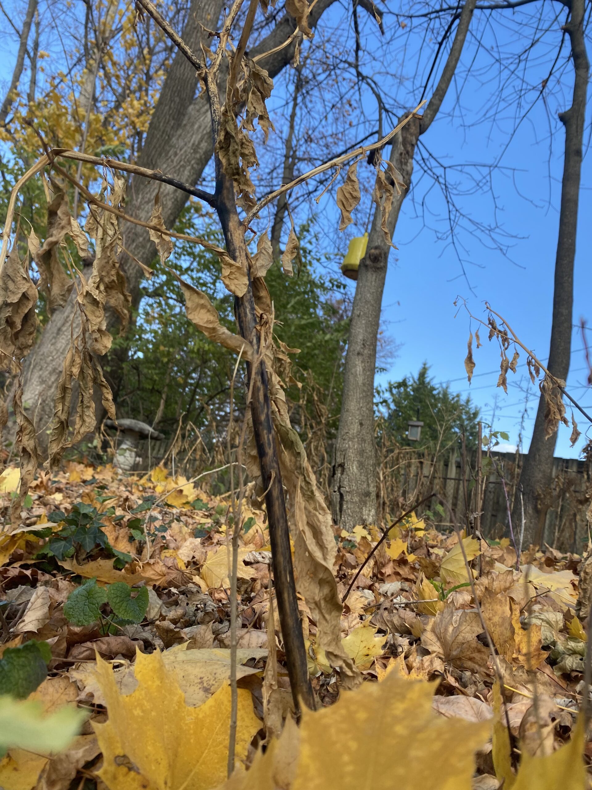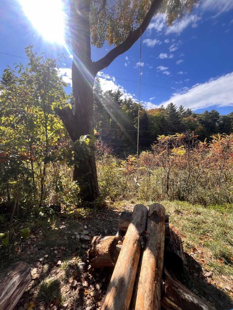 I revisited to my spot early afternoon on October 29th, it was a windy chilly day but the sun was out, and with a jacket on it was nice. I spent a lot of time watching the tall pines trees “behind” where I was sitting. The way they sway in the wind is beautiful, giant things that are so solid and powerful yet they are able to effortlessly dance in the wind. The sound of the wine in the trees, but also in the tall reed’s was prominent. The rope swing was blowing back and forth in the wind as well. My location has drastically changed, when I first visited the leaves were bright greens and on the trees, now everything has dropped. Yet the understory has remained similar, the reeds and bushes that surround my area have not changed much and the pines are still clinging to their bristles. When you look straight up you see the wooded tops of the trees no longer adorned by bright green leaves like they were a couple of weeks ago.