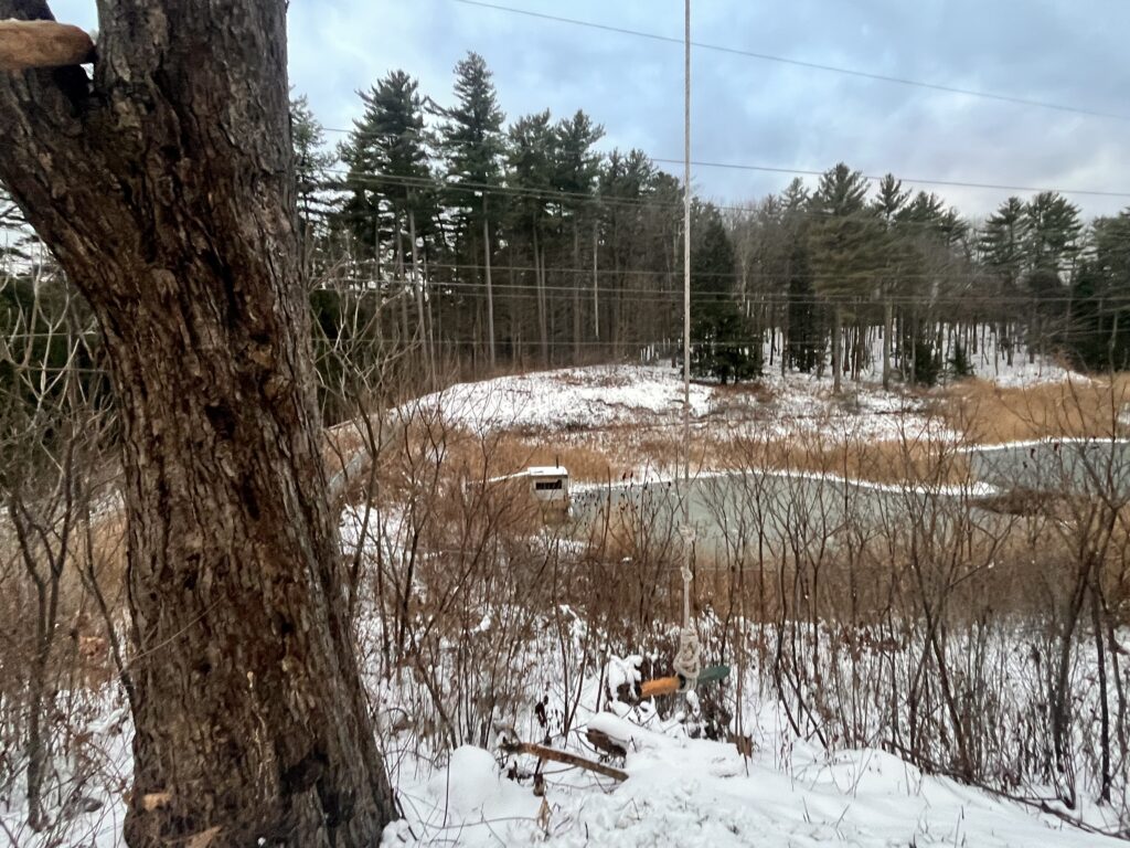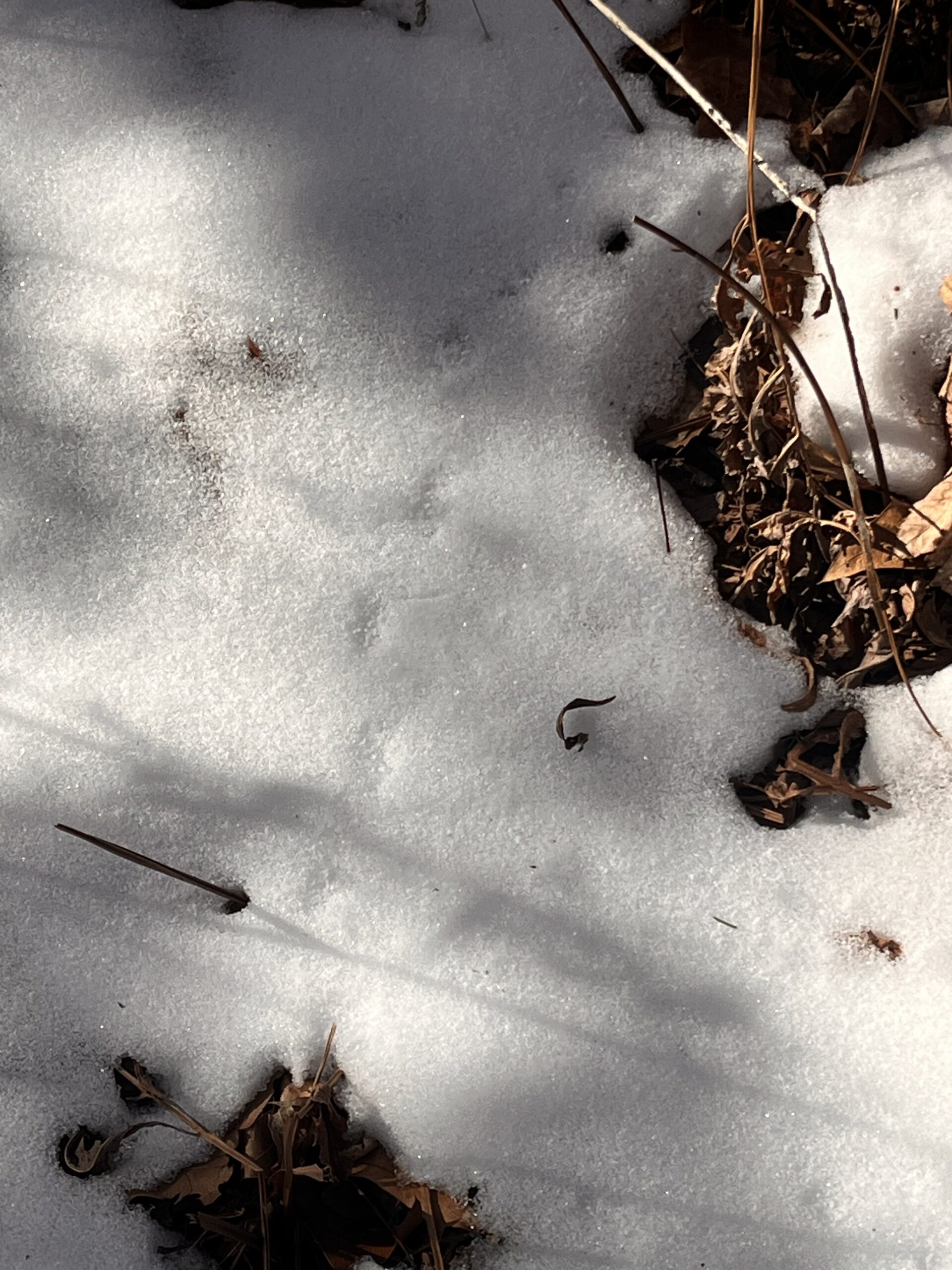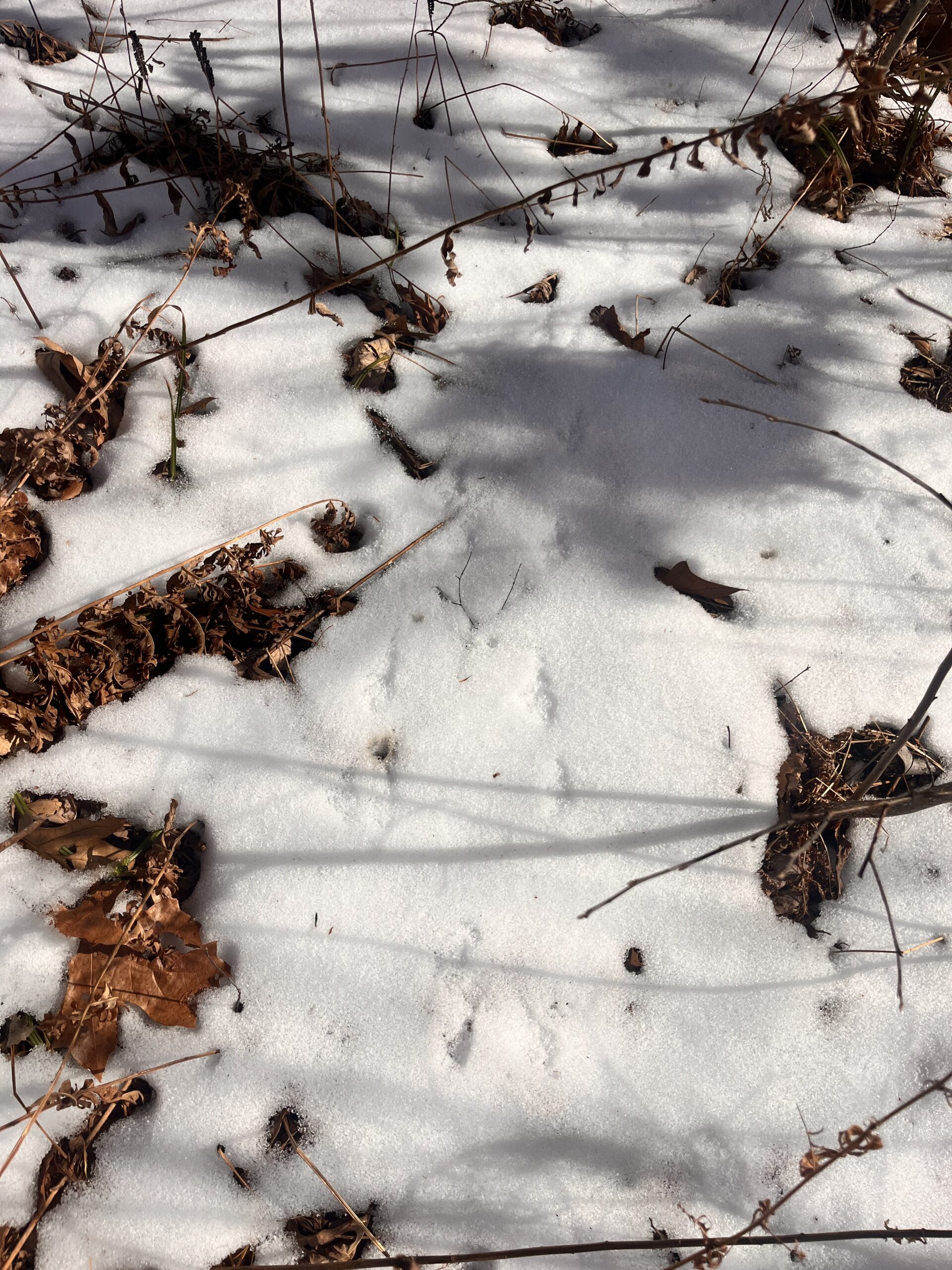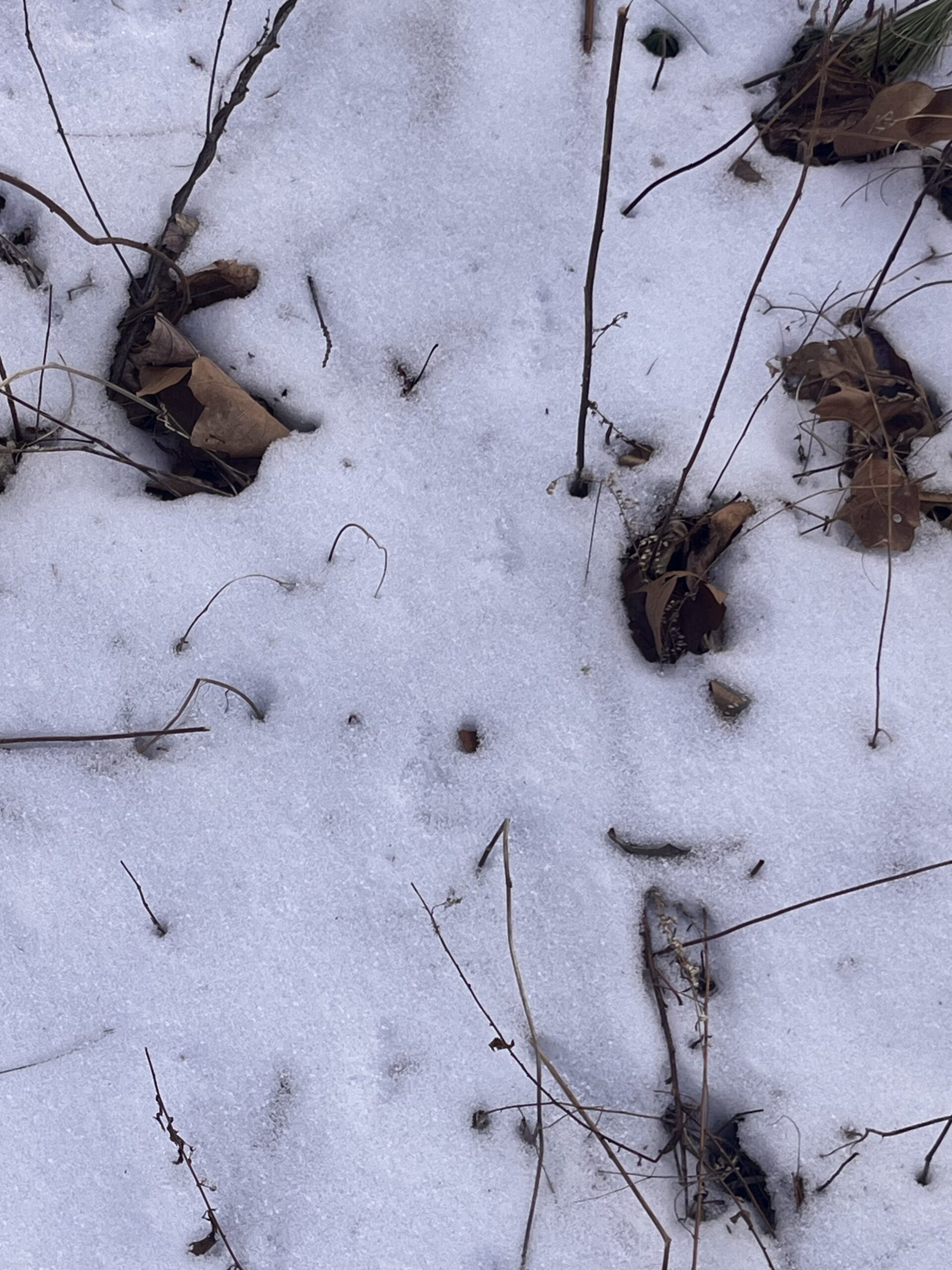 My last time visiting the site was on December 8th with snow on the ground, almost all of the leaves had fallen except for some withered brown red oak leaves. The giant reeds that lined the lower edge of the area had fallen and revealed some evergreen trees that still had all their needles a bit further away then i was able to see before and the pond had frozen over. The ground was covered in snow but leaves and woody debris were poking out around the space. I looked for animals for a while and noticed that without leaves it was easy to spot bird nests in the tops of the trees and did see several small birds when at the spot. I was unable to find any animal tracks other then the shoe prints that were scattered around.
