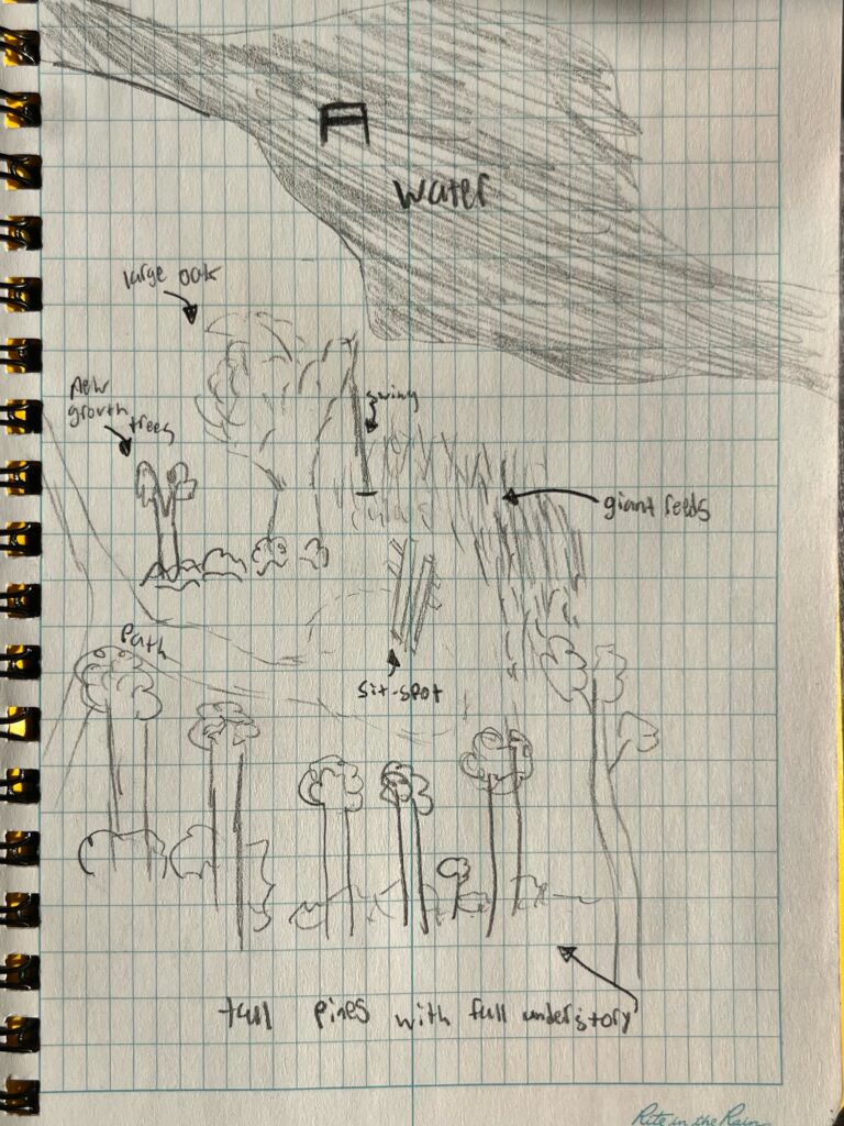 My site has changed with time and watching those changes has made me feel a lot more connected with the land and just made me pay attention to the little shifts that change with the seasons. One small change that makes all the difference are the ferns and grasses that surround my area. they started huge in the fall, surrounding the area like a grown crop. Tall and thick and seeing them change with the seasons has been wild. They all but disappeared in the winter and the regrowth process has been fun to watch and i cant wait to revisit it next year.