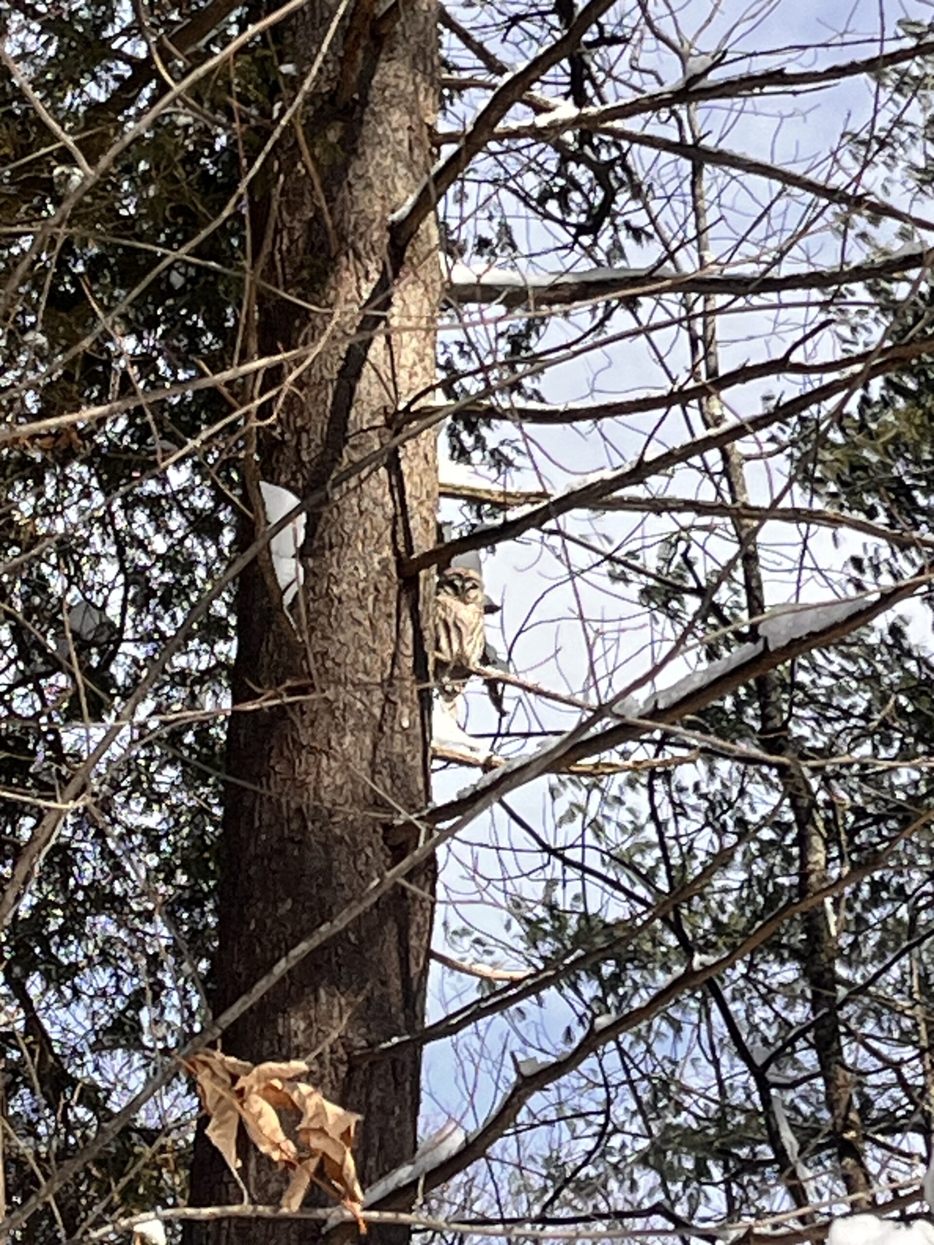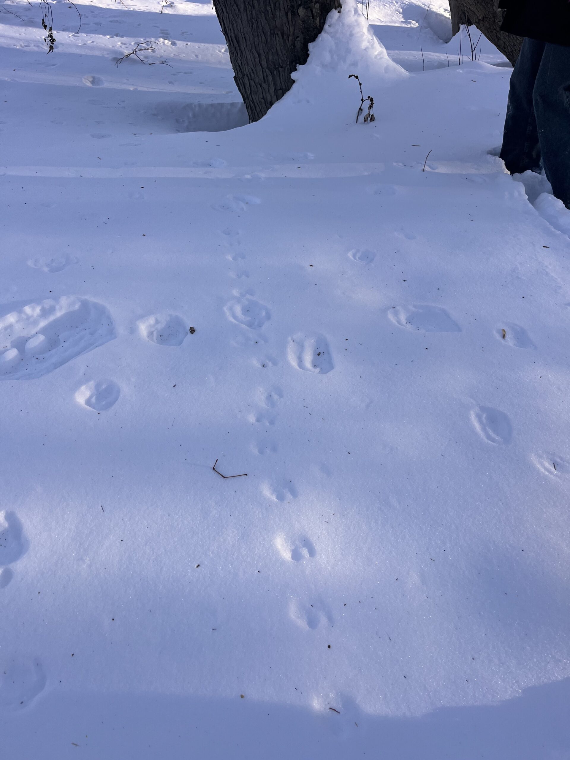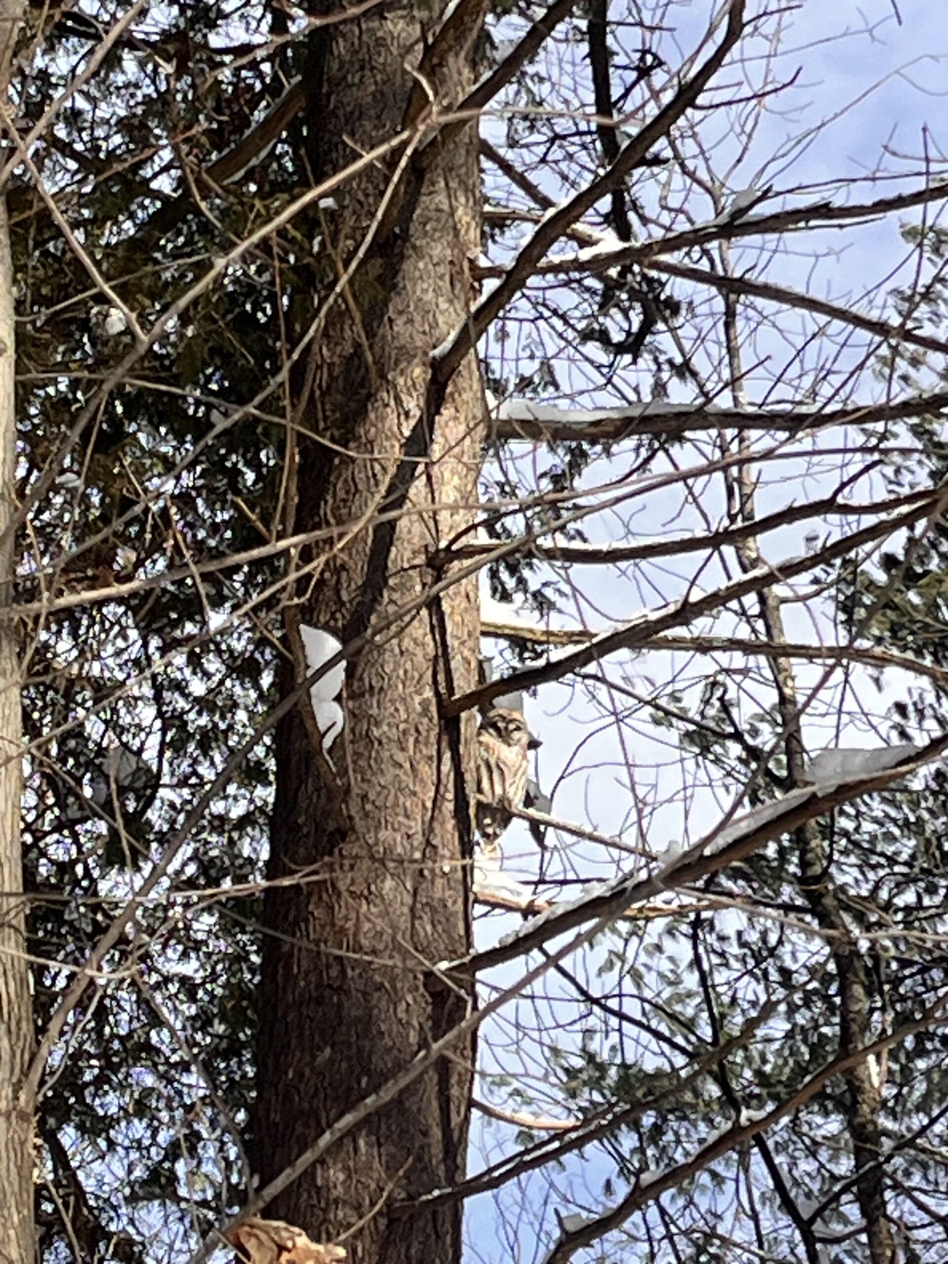 For this assignment (and my own personal enjoyment) I trekked to north beach, and rock point park on the Sunday after the huge snowfall, unfortunately because of the violent wind that day i did not see many tracks but i was lucky to spot a beautiful owl perched about 20 feet up a tall white pine tree. I sat and watched it for 30 minutes hoping to see it fly away but it outlasted me in the cold and i had to keep moving. I am so happy i saw this really really pretty bird in the wild and even got a half way decent picture! I also visited intervale for lab on Wednesday the 19th and was able to find several tracks, but even my TA admitted it was hard to identify them because of the depth of the snow, but i am confident that one thing we saw was some sort of burrow beneath a tree with a long set of bounding prints leading to it. we like to think it was a otter because it was so close to the river but i cant say that for sure.
