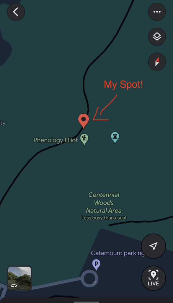 I wouldn’t consider myself a part of this place, but I am definitely a visitor. Even in a high traffic area like Centennial Woods, I still think the land should remain as untouched and unaffected as possible. I’m a viewer of this part of Centennial Woods for sure, but I am not actually changing any part of it. To be truly part of a place you have to participate in all aspects of it, and I am not doing anything I am just observing and enjoying. I would love to be a part however, and one day I hope to come back and help the area in some way to pass from just a viewer to a part of it.