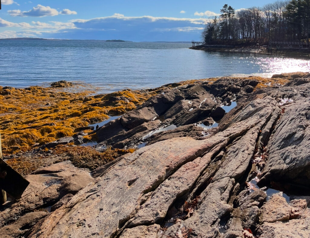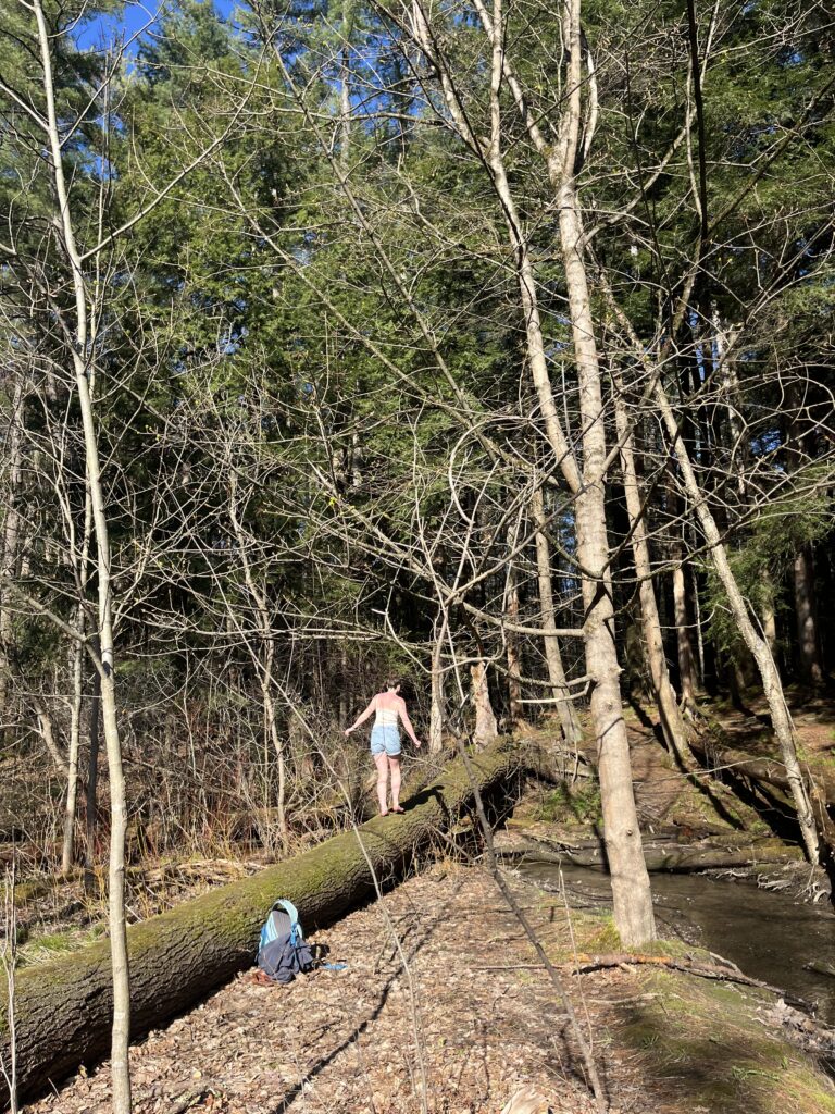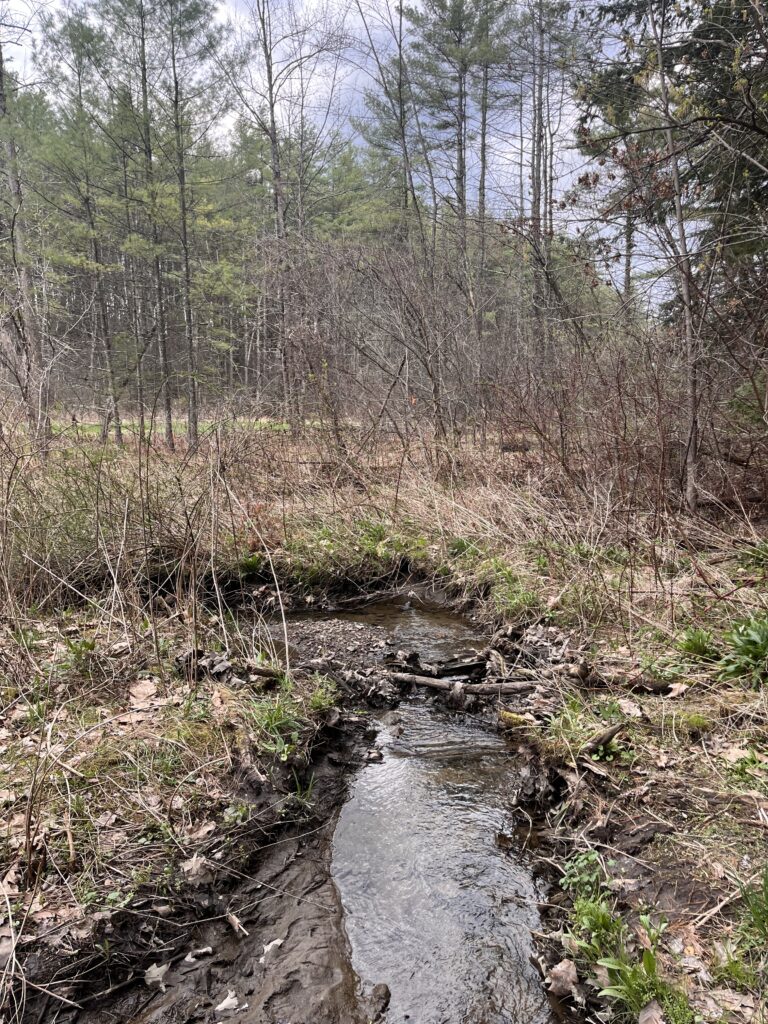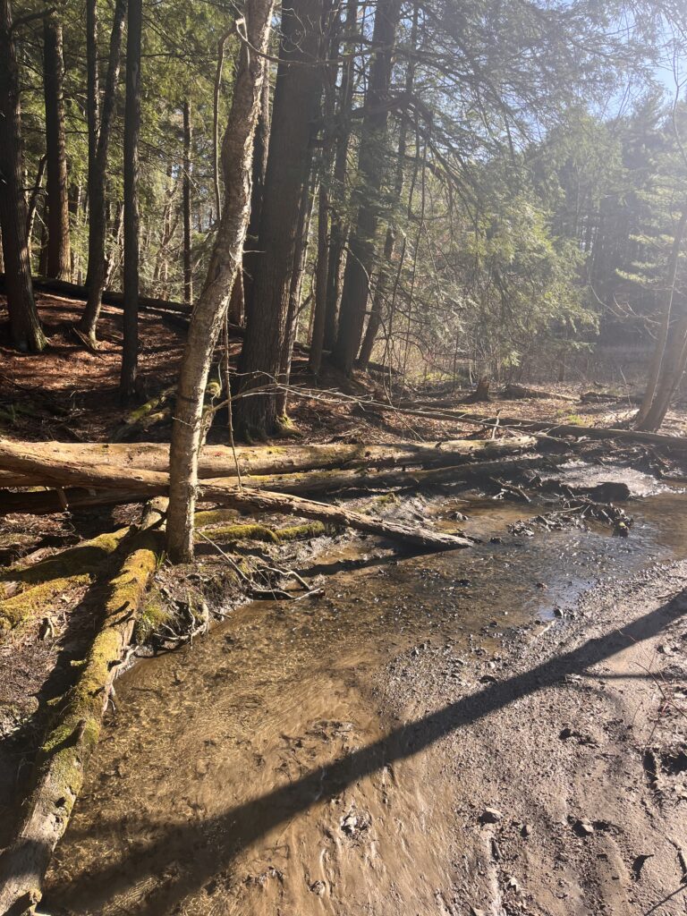 My favorite way to get to my spot is to walk across a log over the brook, then along the pebbles and mud down to where there’s a little island in the center. That’s where the sketch below was done from. That spot is my favorite. It’s surrounded by running water, and there’s plenty of young plant life. From my observations and also weather patterns in Vermont, I’d guess that the little island floods often, triggering a sort of succession with the smallest plants. I like that it showcases a lot of the concepts we talk about in lecture and lab.