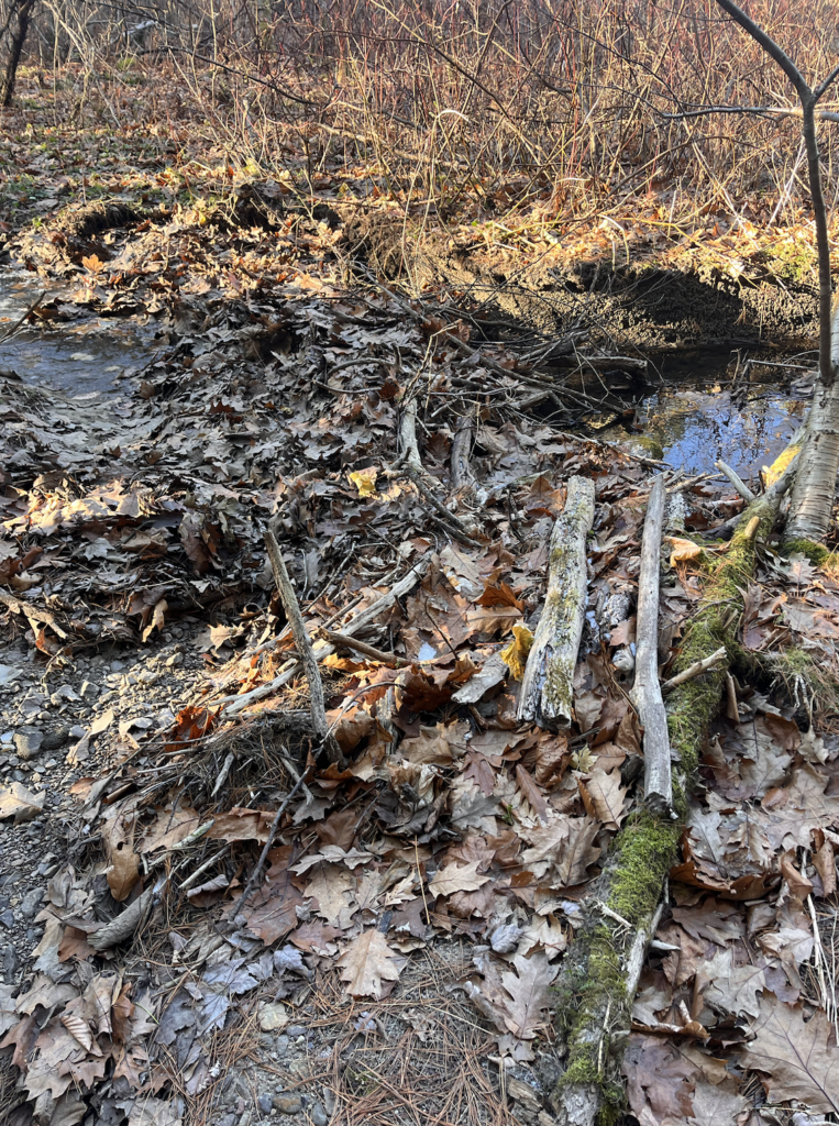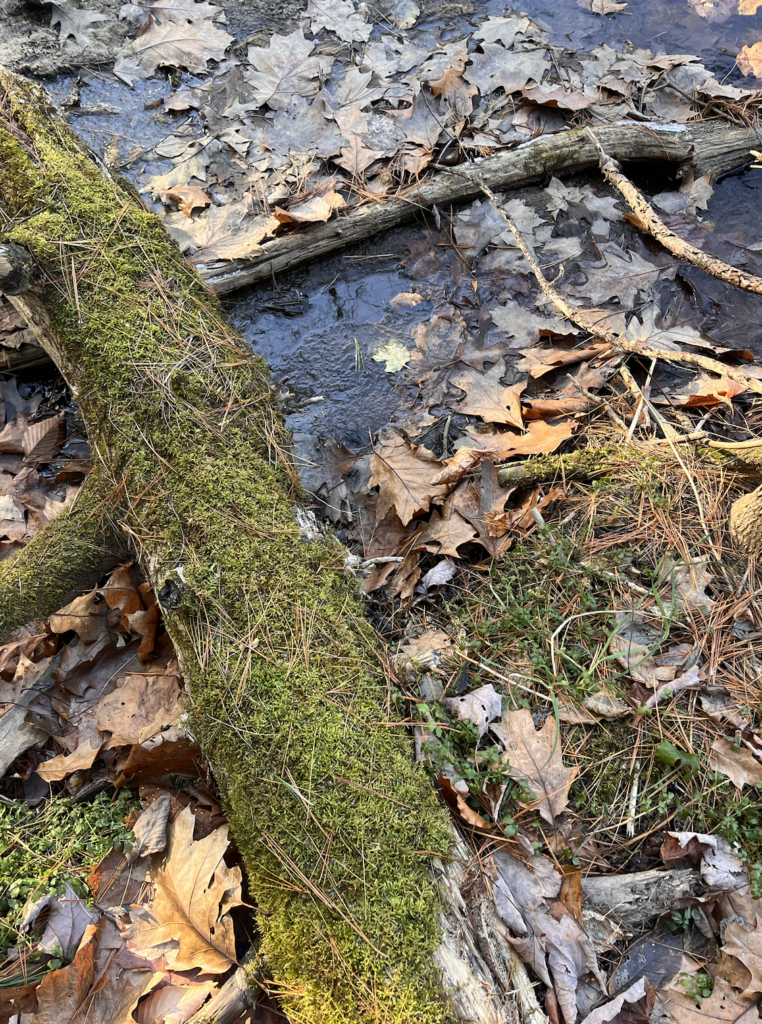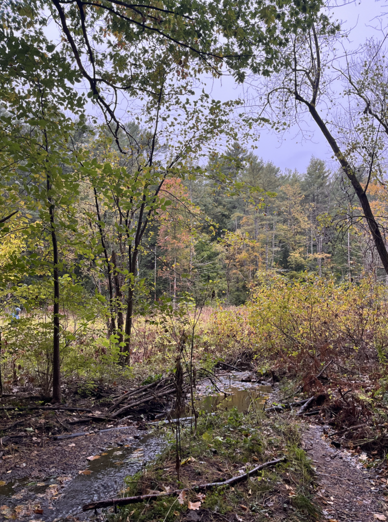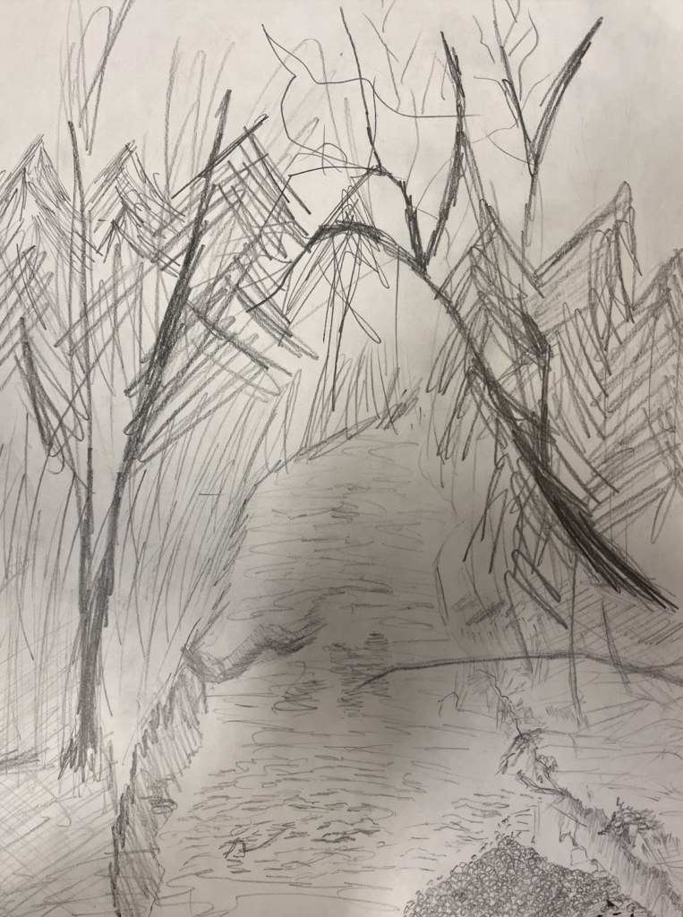My favorite way to get to my spot is to walk across a log over the brook, then along the pebbles and mud down to where there’s a little island in the center. That’s where the sketch below was done from. That spot is my favorite. It’s surrounded by running water, and there’s plenty of young plant life. From my observations and also weather patterns in Vermont, I’d guess that the little island floods often, triggering a sort of succession with the smallest plants. I like that it showcases a lot of the concepts we talk about in lecture and lab.