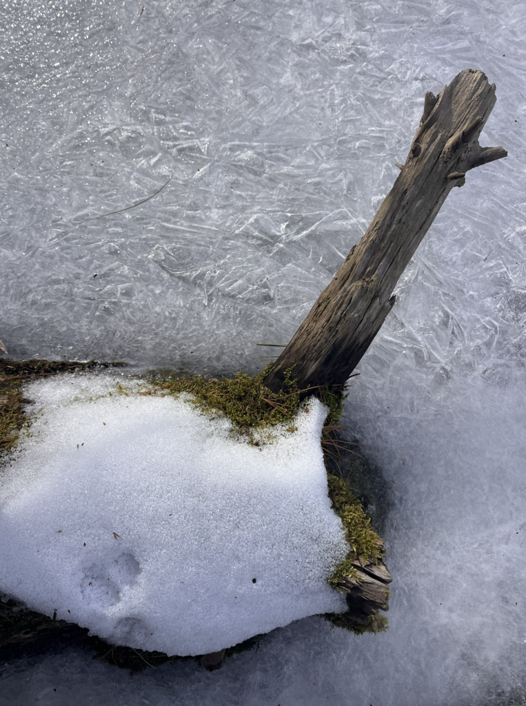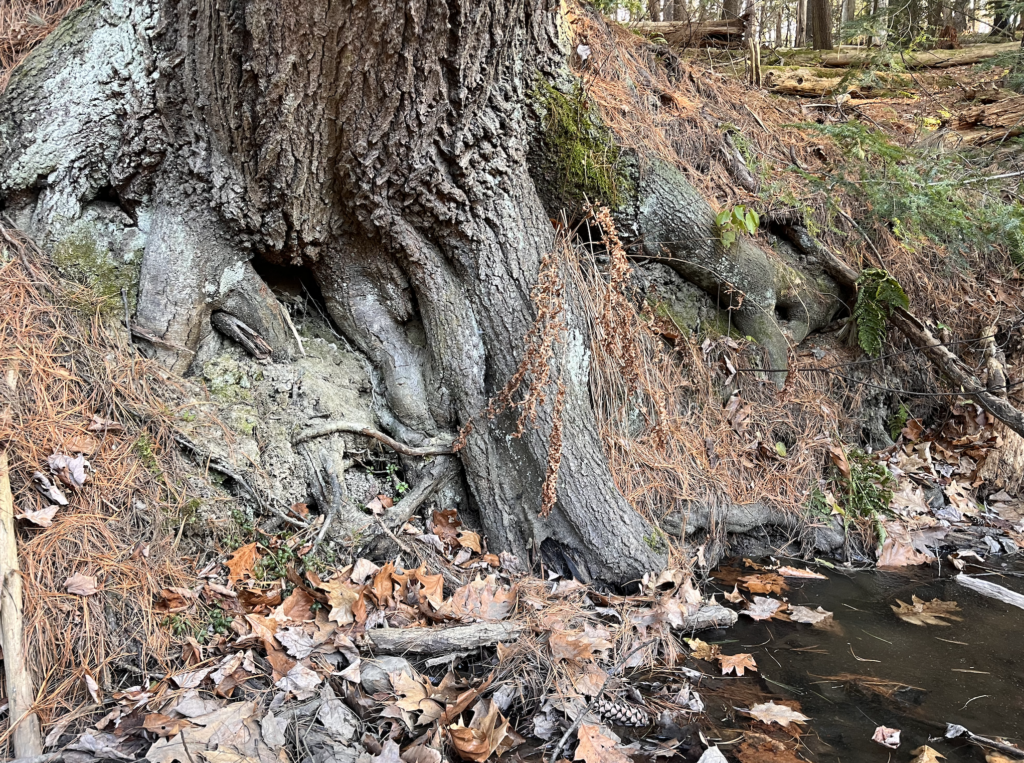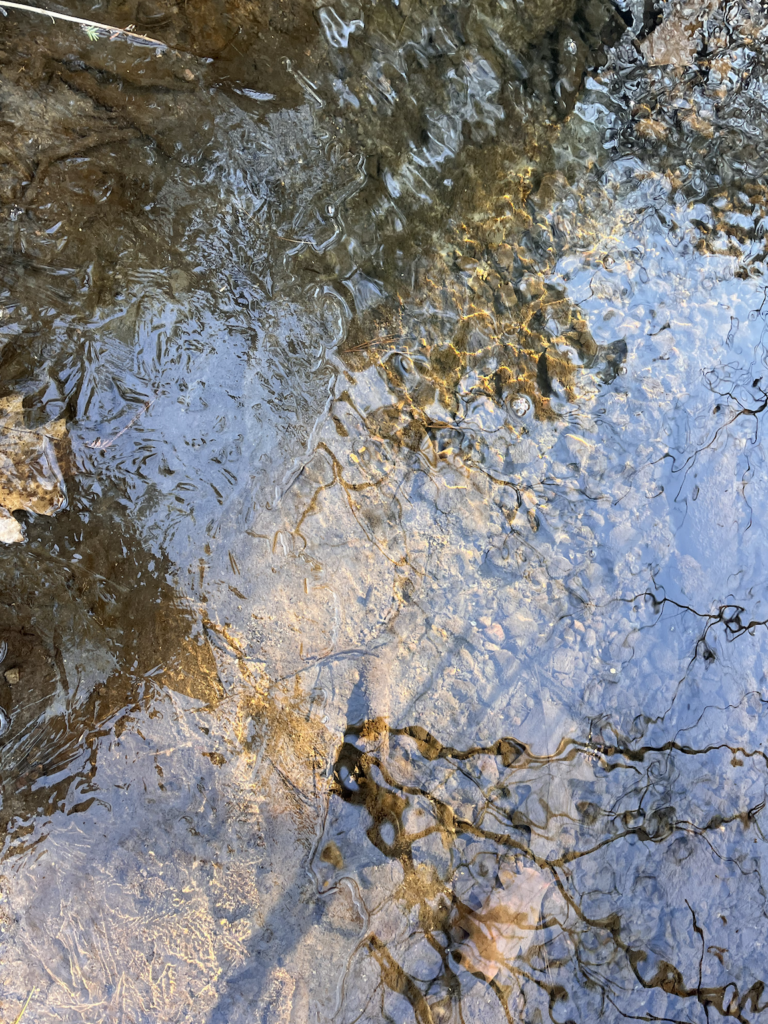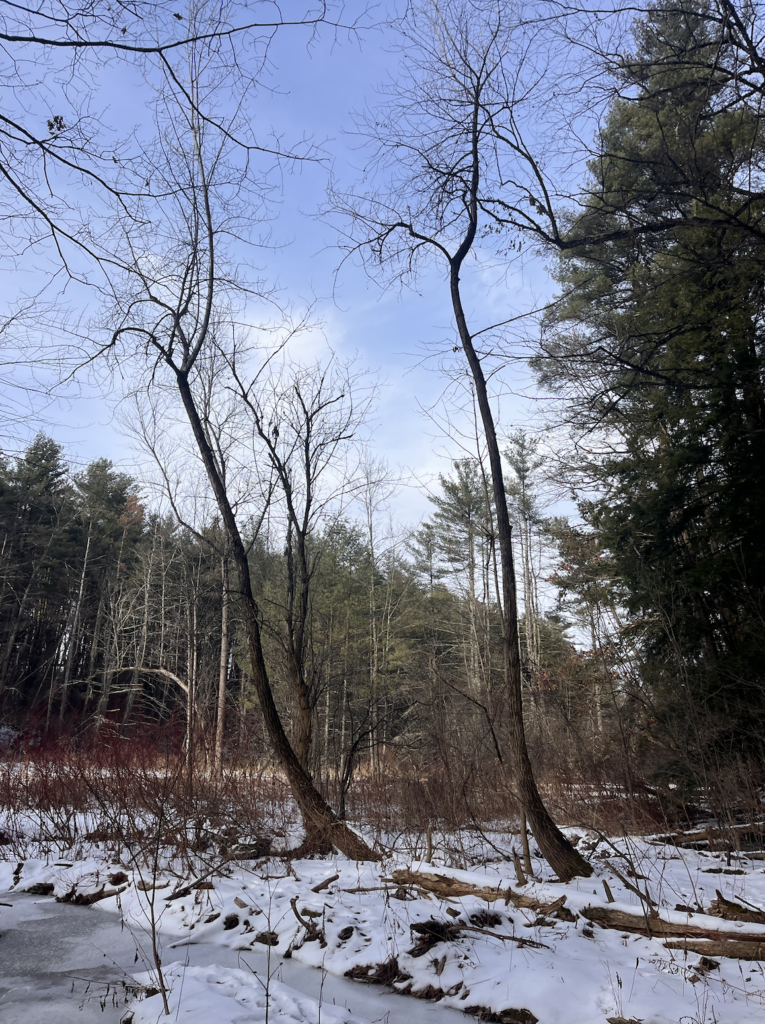 My favorite way to get to my spot is to walk across a log over the brook, then along the pebbles and mud down to where there’s a little island in the center. That’s where the sketch below was done from. That spot is my favorite. It’s surrounded by running water, and there’s plenty of young plant life. From my observations and also weather patterns in Vermont, I’d guess that the little island floods often, triggering a sort of succession with the smallest plants. I like that it showcases a lot of the concepts we talk about in lecture and lab.