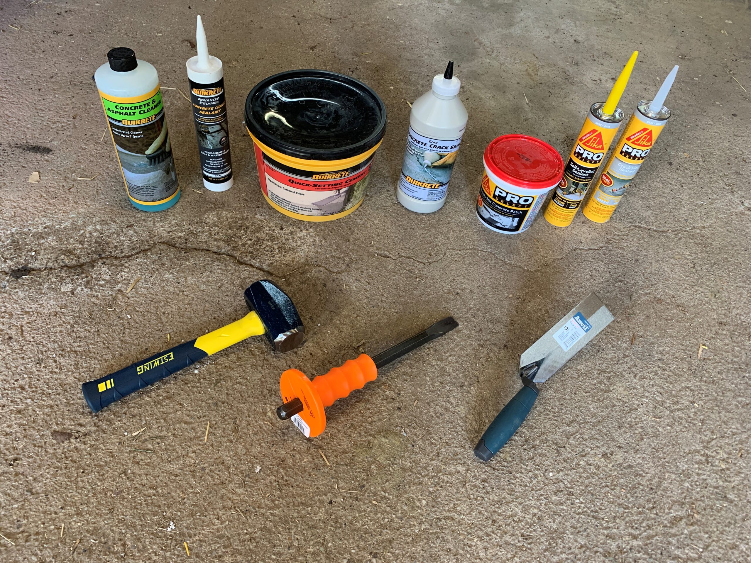 Some of the tools and supplies that are needed for concrete repairs. Back row (L to R): Quikrete Concrete and Asphalt Cleaner Concentrate, Quikrete Advanced Polymer Crack Sealant, Quikrete Quick Setting Cement, Quikrete Gray Concrete Crack Sealant, Sika Pro Select Ready Mix Concrete Patch, Sika Pro Select Self-Leveling Sealant, Sika Pro Select Crack Flex Sealant. Front row (L to R): 3 lb hammer, Masonry chisel, 6”x2” margin trowel.