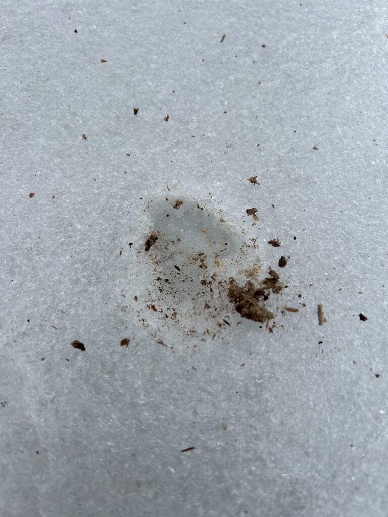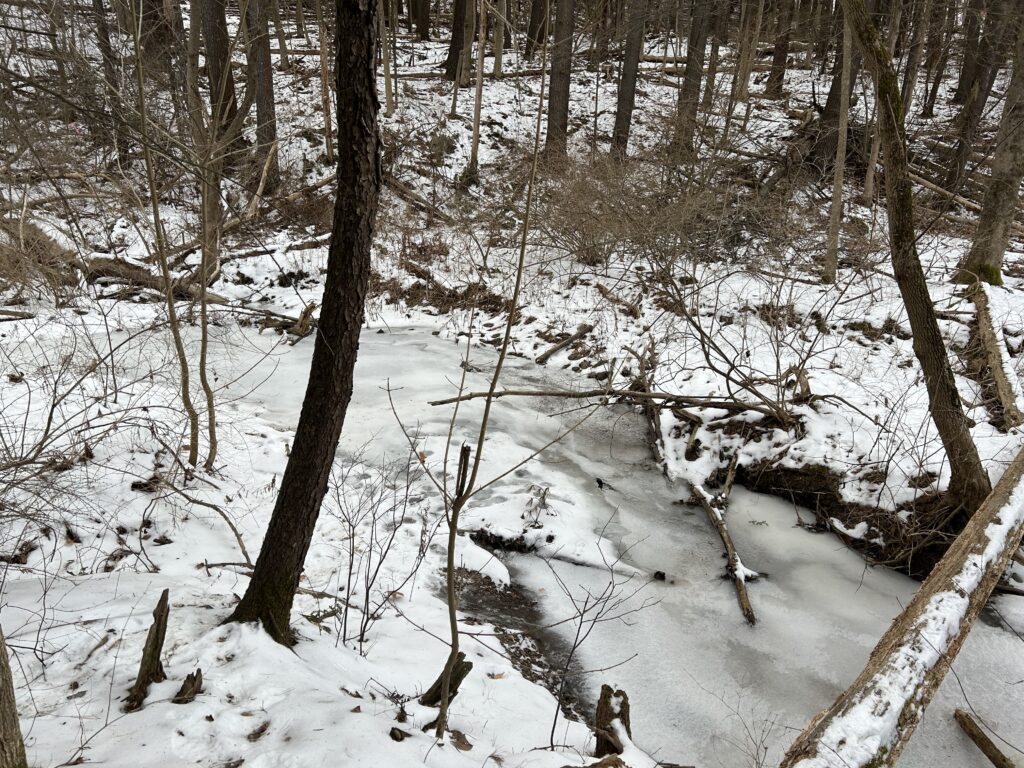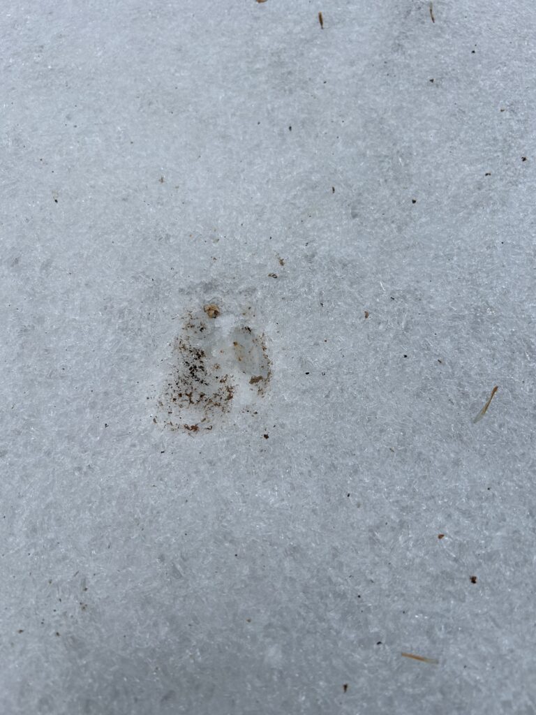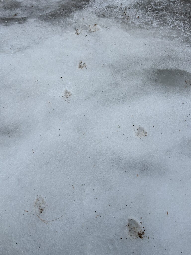 In terms of phenological changes, much was different. The few green plants that still remained in December have either been buried in snow, or decomposed; except for the few Eastern Hemlocks nearby. The stream has frozen solid, with ice thick enough for me to walk across. The ice also revealed some animal tracks. I’m not sure what produced the tracks, but they are very small, only about 2 inches across. Other than these tracks and the occasional call of a crow, there were not any other signs of wildlife.