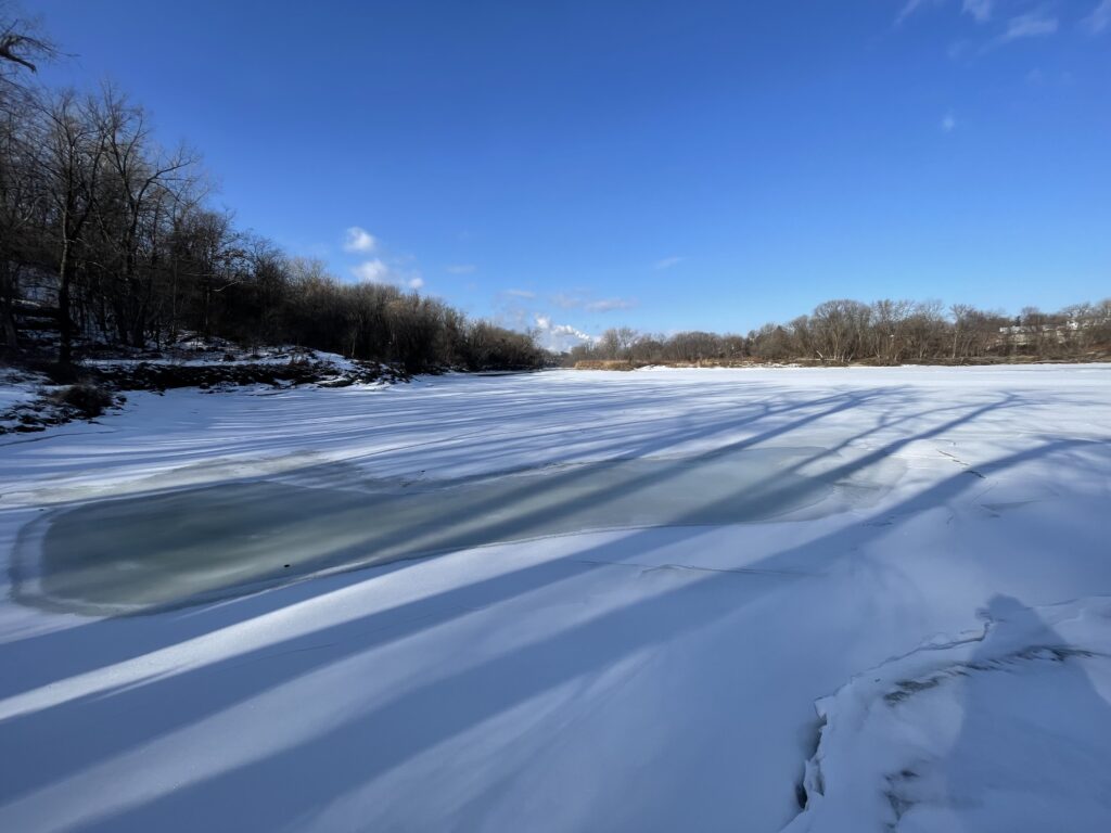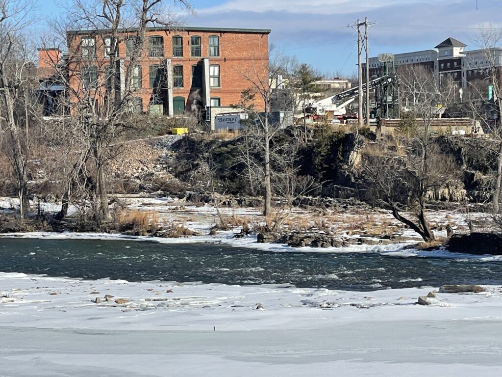 Since my last visit, the Winooski River at Salmon Hole has mostly frozen over. There is a section towards downtown Winooski that is not frozen over, but otherwise, the river is covered with a layer of ice and snow.