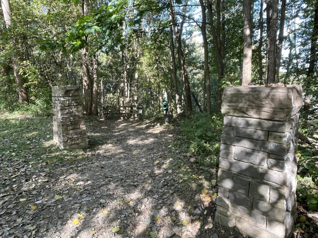 Walk past this sign for about a minute until you see a narrow path leading into the woods. Take this path. You’ll know you are heading in the right direction if you find two stone pillars opening up to another path.