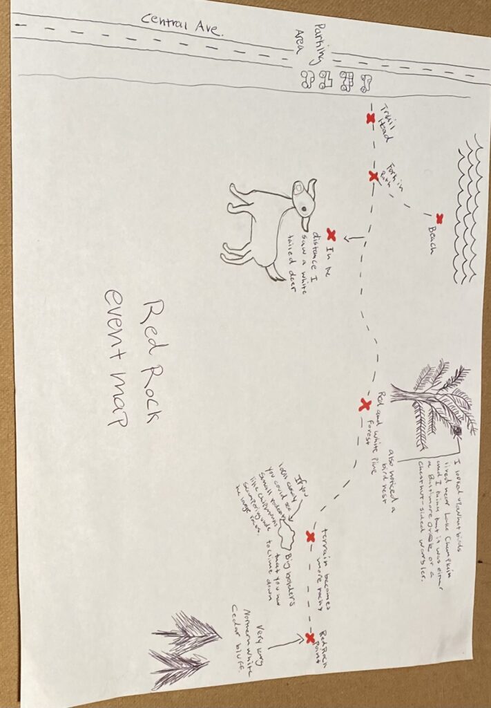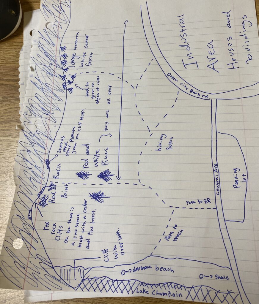 This was fairly hard to draw out mainly because Red Rock Point is in the middle of a densely populated forest with lots of trees such as White and Red Pines and Northern White Cedar. You can find some man-made hiking and walking paths along the way with signs to guide you through the woodsy forested path to the Red Rocks spot. This spot is pretty hard to get to but it is definitely worth the hike, hope my birds-eye view map was helpful for anyone that wants to visit my phenology spot, make sure that if you visit my spot to share the photos that you take with me, I would love to see them, send them to demsfeld@uvm.edu.