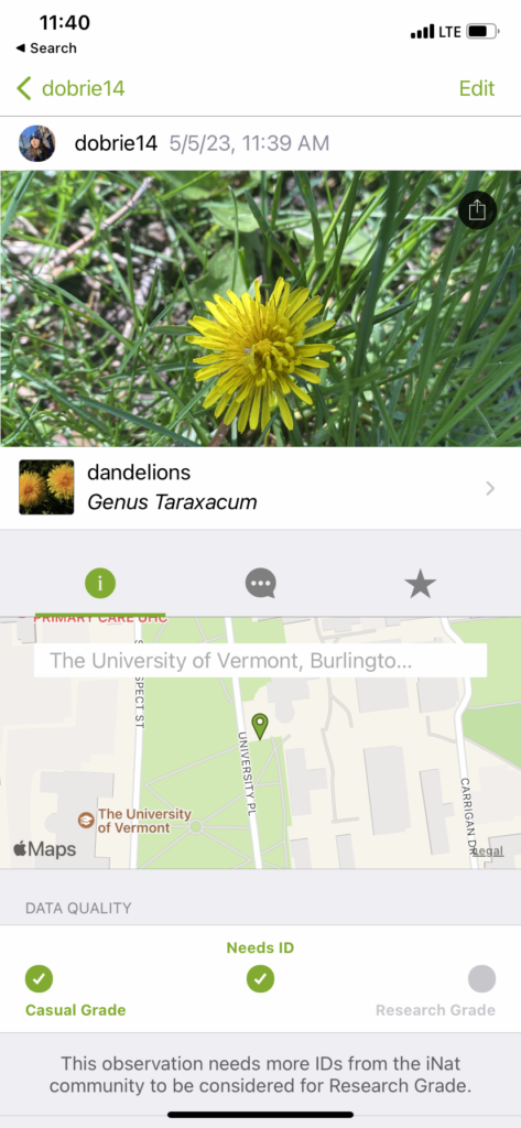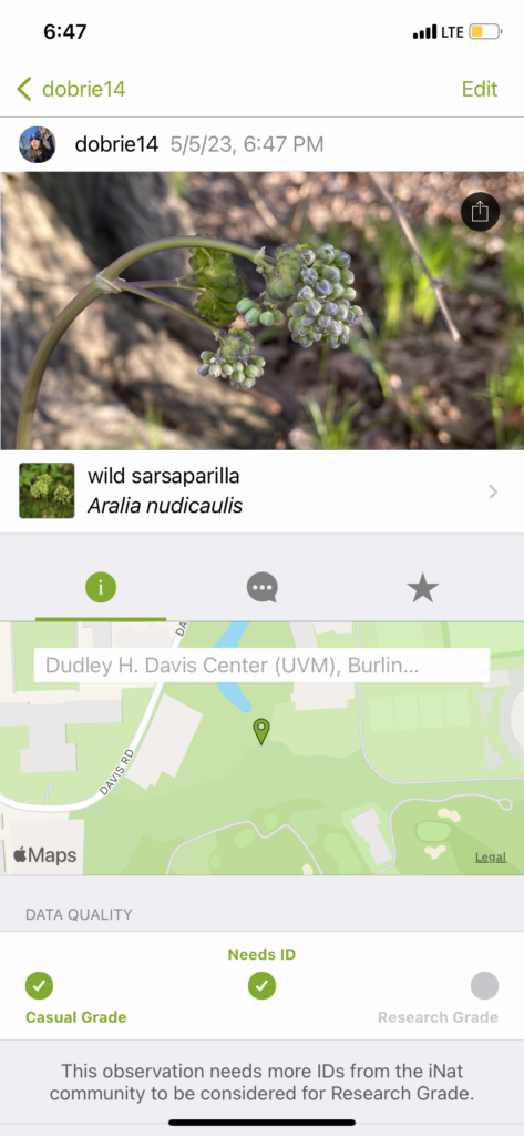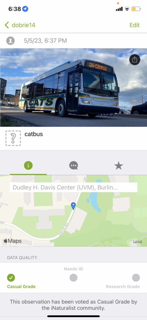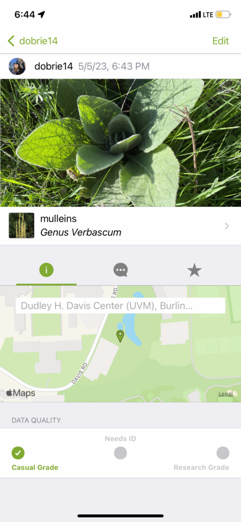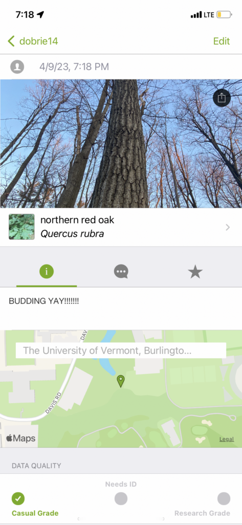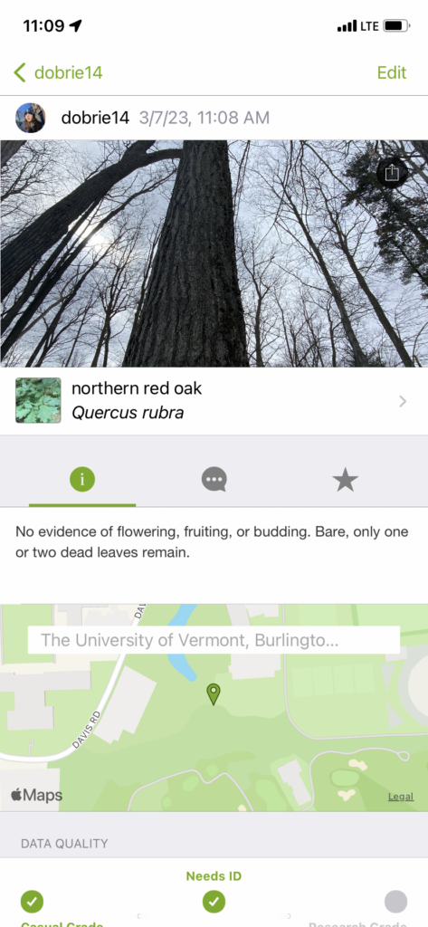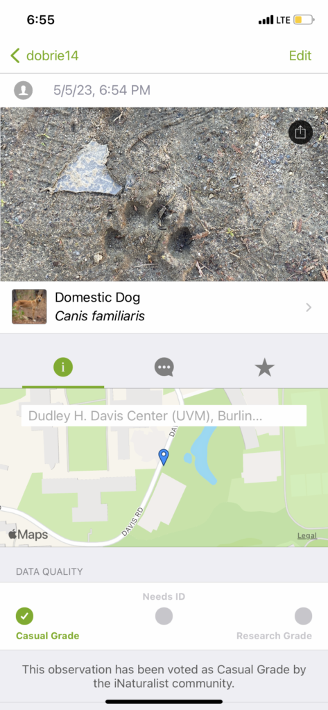 Hiiii, some how the year has flown by and I am now turning in my last phenology blog submission wow! In addition to the finalized blog, I was instructed to talk about my experience with the City Nature Challenge iNaturalist BioBlitz. Unfortunately, it has been a rough end to the year for me with mental health issues, and the rain definitely didn’t help, but as the sun poked out the past few days I did some exploring just around redstone campus to capture some iNaturalist observations! I really love using iNaturalist to provide answers to my curiosity, but obviously it is not always correct, I regret not going try hard and exploring more of Greater Burlington and finding more species but I did get outside and scan some of the plants that I see everyday, but was never sure of the names. Some of these include arborvitaes, dandelions, genus reynoutria, mulleins, wild sarsaparilla, maple trees, and domestic dog foot prints. It was very nice taking a non Rubenstein friend out and about to scan and observe these common plants and just enjoy some fresh air. I loved seeing the comparisons of different cities, and I would love to see the City Nature Challenge take place in a different city one day. Thank you for teaching me so much, and I am excited to be back and take advantage of my resources better next year (and go try hard in the City Nature Challenge 2024)