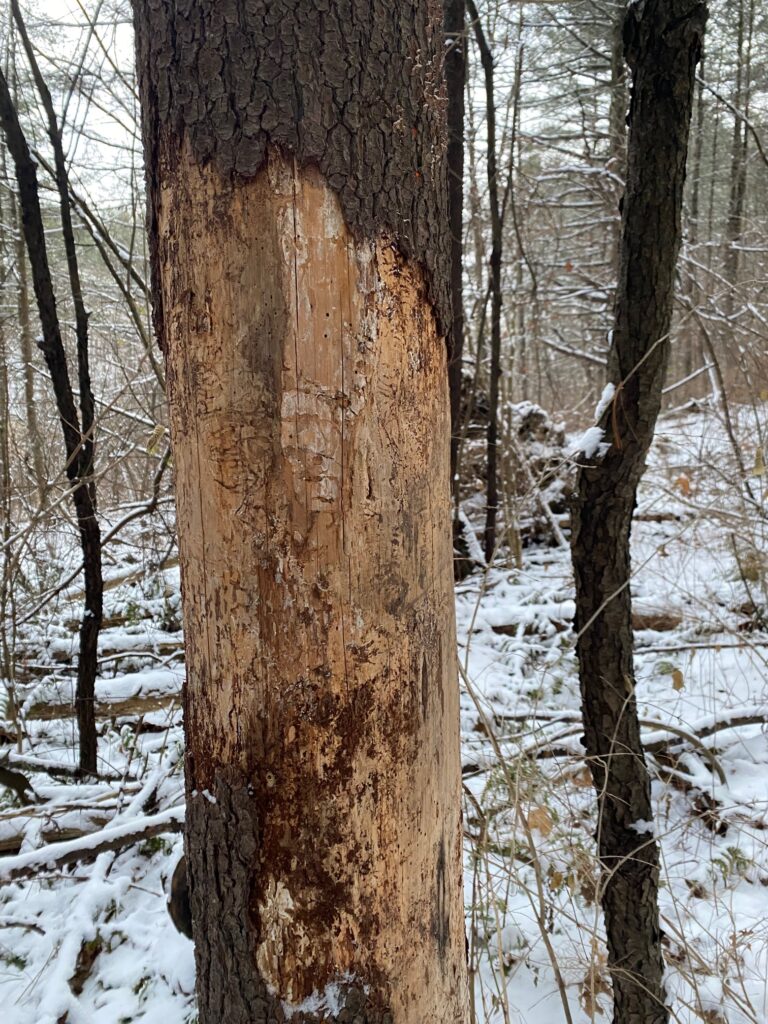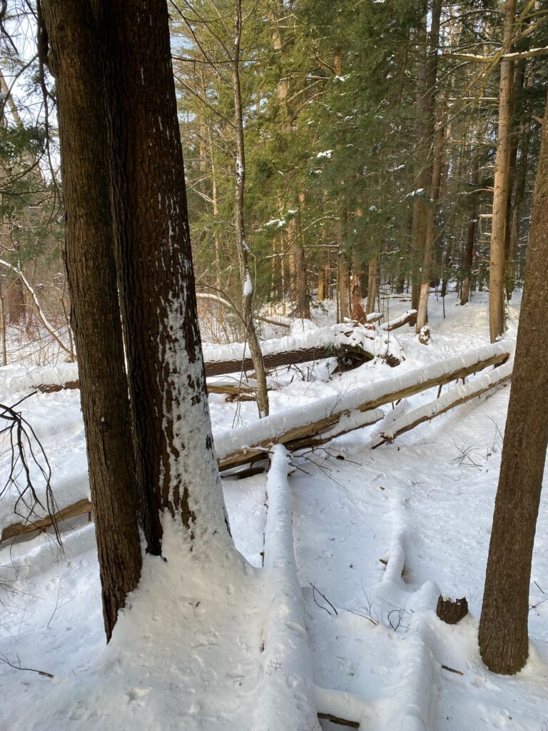 One of the main trees that we encountered was American Beech. This picture was actually taken in November, so the brown leaves on the tree can still be seen. When I walked passed this tree again in March, all of its leaves had fallen, but I could still recognize the commonly occurring tree by its smooth, grey bark that I’ve always found very distinguishable from other deciduous trees. The phenological condition of the Beech trees was still coming out of winter: no leaves or signs of budding yet, only recognizable by the park. Other native trees that I saw that were common were Eastern Hemlock (shown below) and White Pine, as well as Paper Birch and common Sugar Maples.