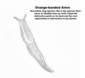 I enjoyed this process because I’m more inclined to research what species are around me instead of just looking them over as I normally would. This last time I visited, I noticed there were a lot more millipedes and snails on the trail than the other times I had gone. I believe this might be because of the humidity. I spent a bit of time looking for insects before starting my sketches simply because I was a little curious. I’m not very used to working with paint, and watercolor itself is something that takes a bit of getting used to. I think it was a really interesting task to try and create texture by mixing colors instead of just using crosshatch shading. Overall, I think the finished product isn’t perfect, but it definitely pushed me to look more closely at the subjects that I chose.