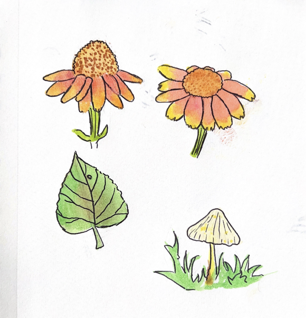 This page has orange coneflowers, a poplar leaf, and some sort of common white mushroom- I couldn’t figure out a specific species for this one. Here are some quick facts about a few of these species:
