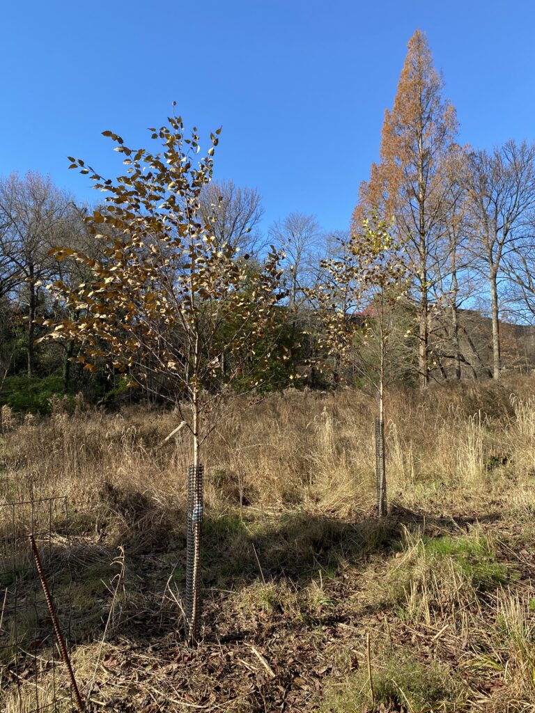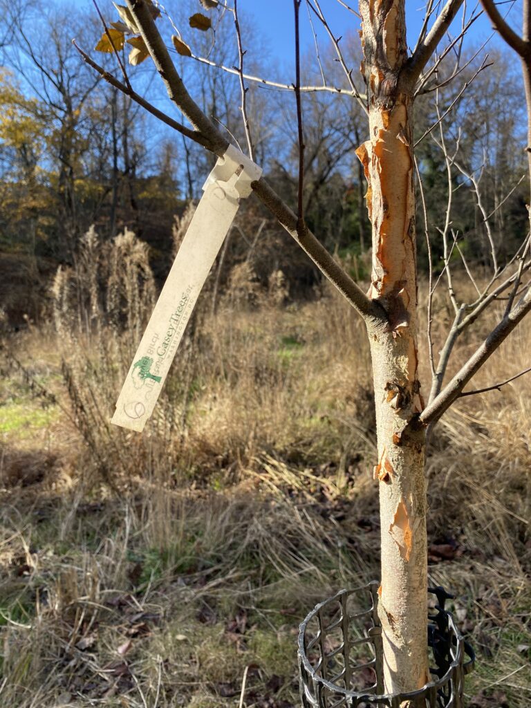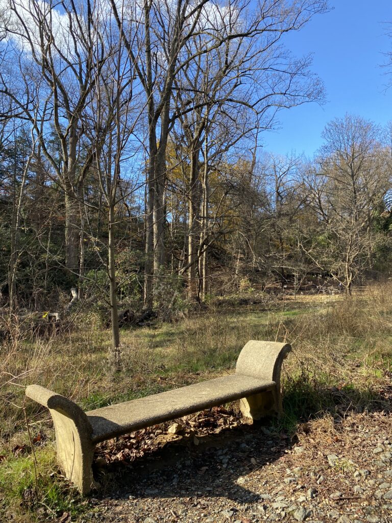 Since Washington, DC is not as far North as Burlington, some trees, namely red oaks, still have leaves on them and the area looks more alive than my spot at Rock Point. There is also a wider variety of trees, such as large holly trees, a hackberry tree, and a few tulip trees. The park is in a kind of valley where a hill drains to, thus the soil here is moist. Overall, this place looks a lot less grey and winter-y as my spot back in Burlington. In terms of similarities, the understory looks pretty similar here to the one in Rock Point, there is a lot of boneset/thoroughwort. Like Rock Point, this area is dedicated to serving the public, with many trails and even benches for people to rest, like the one that I sat on, pictured below. I also noticed that the company Casey Trees, which is a well-known non-profit dedicated to increasing green space in DC, has planted some river birches in this area, likely to help make this area even greener.