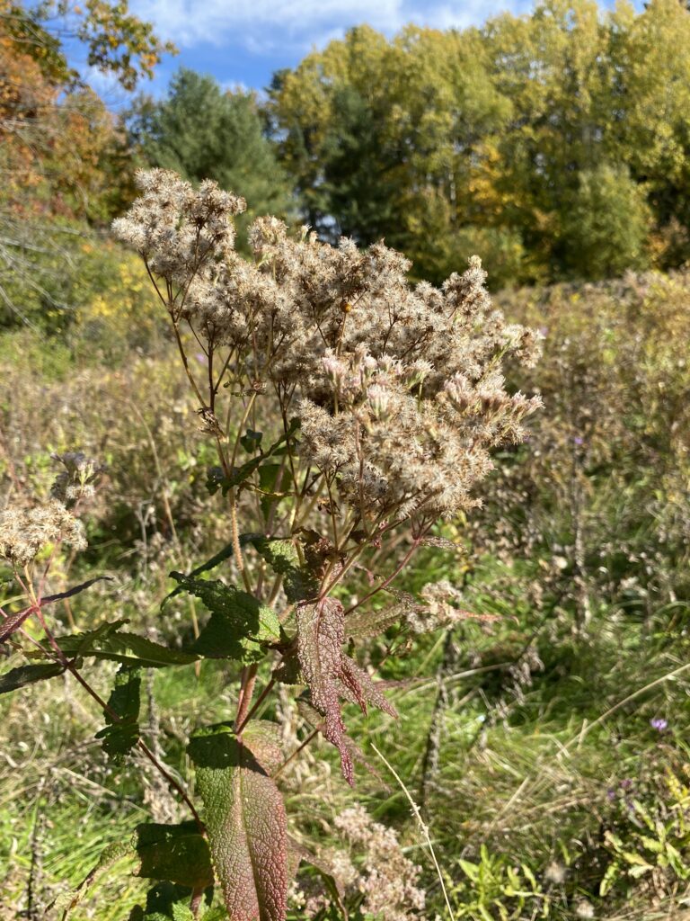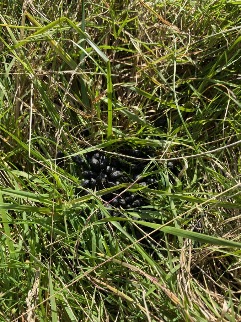 Short description of the vegetation: The ground is soggy, the grass is so wet that you can hear it squish under your feet as you walk. There are tons of tall thistle-looking plants, which I used the app Picture This to identify and it says that they’re bonesets. There are also some Canada thistles and lots of aster, which has small purple flowers. There’s also lots of little piles of what I think is rabbit poop.