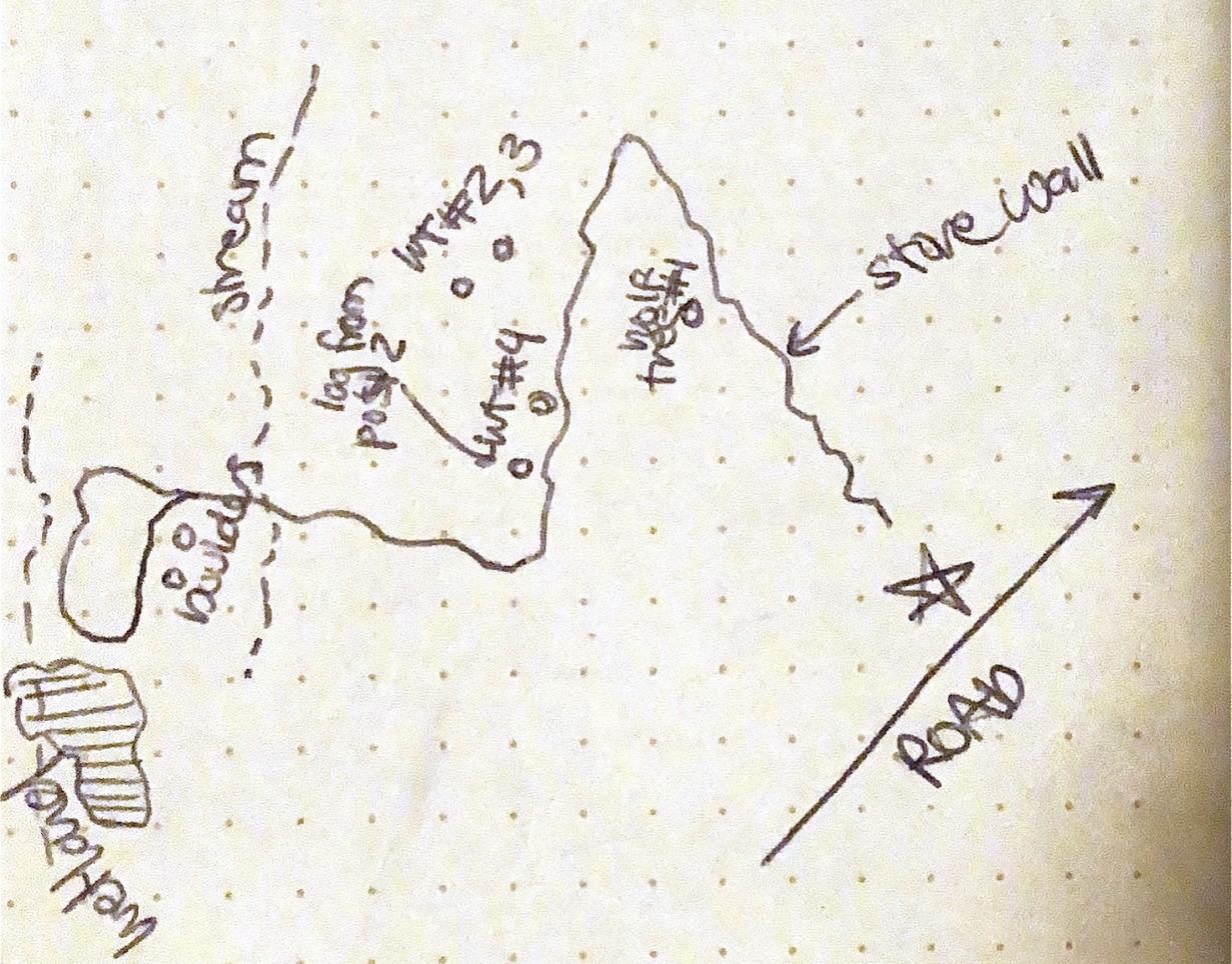 To start out, I returned to my site for a final visit. I had a few different goals for this visit. First, I wanted to record the locations of some of the things I had mentioned in previous blog posts so I could add them to my map. Before I began walking the trail, I sketched the trail map from the sign at the trailhead, and as I walked along, I made notes of certain locations, including the stone wall that crosses the trail and a few of the wolf trees I identified.