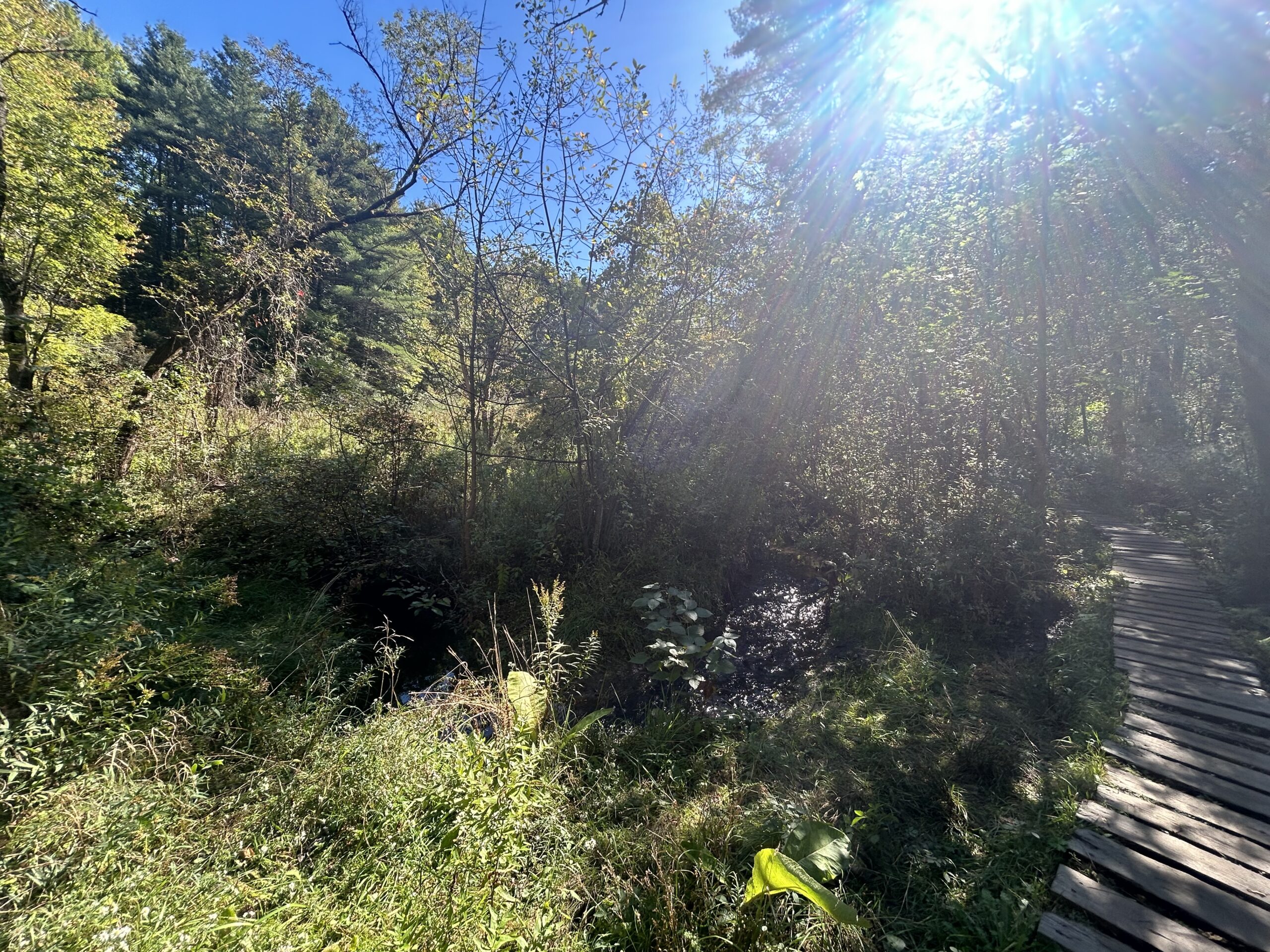 I loved this spot in Centennial Woods from the first moment I saw it on our first lab because of the sound of the brook flowing across the landscape. It was nostalgic of the park near my house which had a small wetland area surrounded by trees. I knew I wanted to focus on the brook, so I chose the area of land immediately in contact with the water on both sides. To get there, I walked about 10 minutes down the trail (entering from Carrigan Dr.). My chosen area begins just past the first footbridge and occupies the land surrounding and crossing the brook. With the interactions of the brook and aquatic life in addition to the forest surrounding it, this area will be fascinating to study as the seasons change.