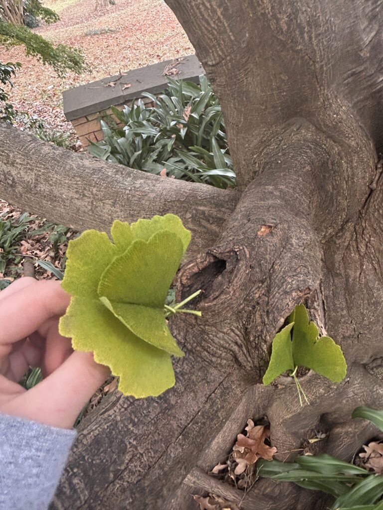 After reading Robin Wall Kimmerer’s chapter on the honorable harvest from Braiding Sweetgrass, I decided to show my appreciation for this park by turning the fallen leaves of my favorite tree, the Ginkgo, into art. I liked the idea of giving the leaves a second life, and I left the two butterflies to rest in a nearby Japanese Maple as I left the park.