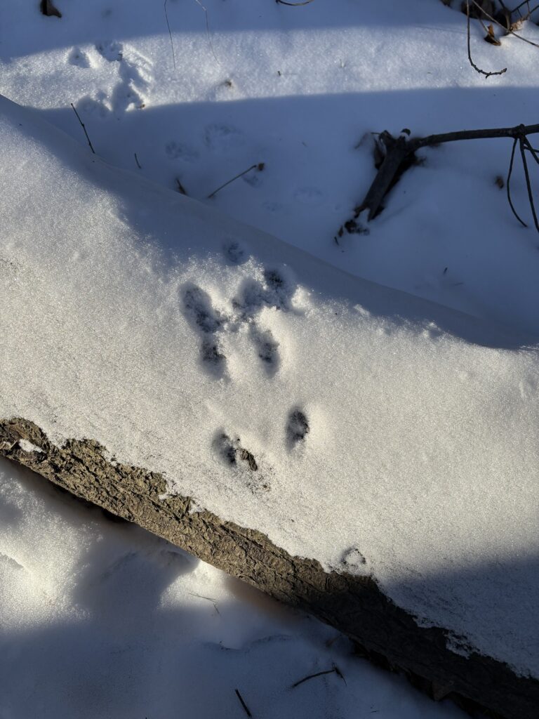 Next, just to the left of the log cross were these tracks, which I believe belong to a Cottontail Rabbit, according to my tracks and scat guide. This bunny hopped all over the place!