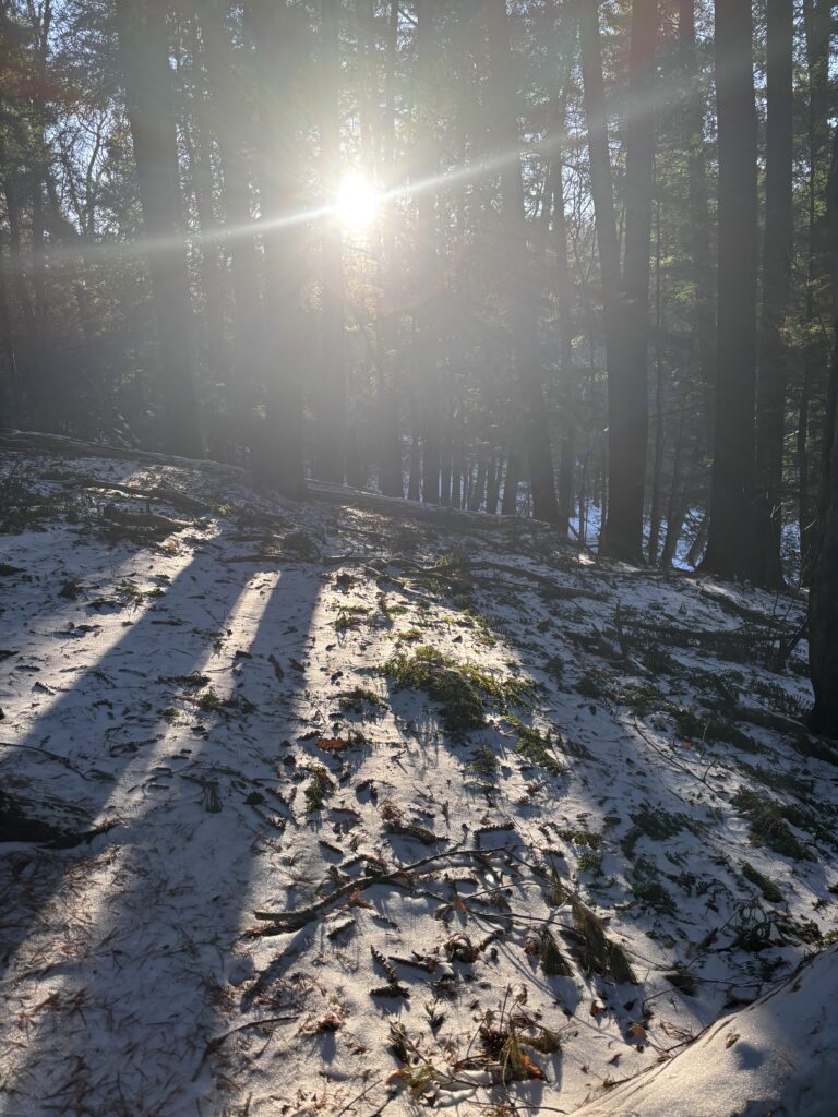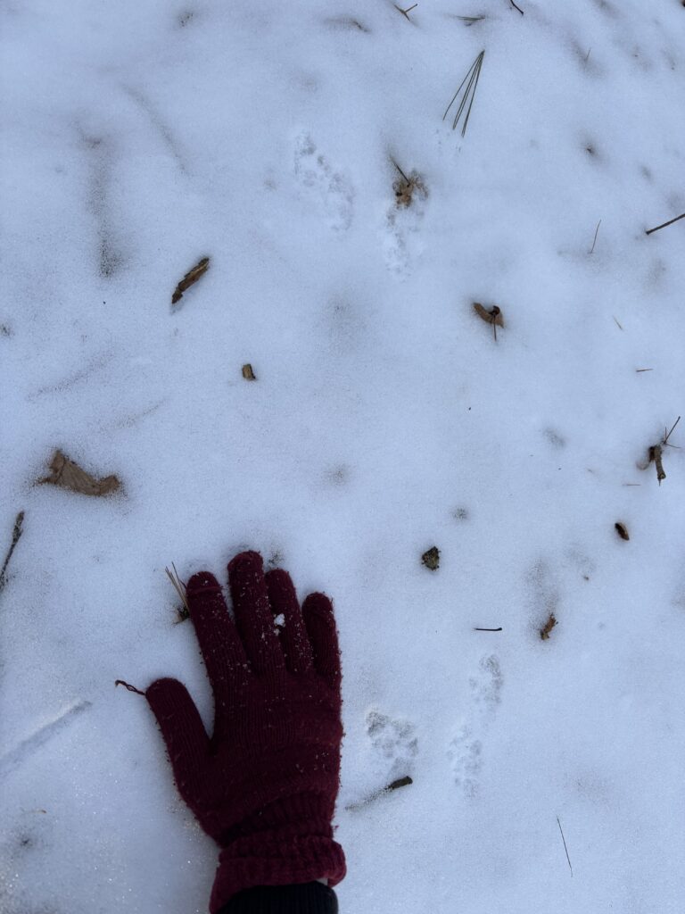 After a warm break in North Carolina, I adventured out into the cold to check on my spot. As I walked, I noticed the beautiful crystalized stream and clear blue, unobstructed by leaves, sky above me. It felt good to return back to the log cross, this time with a new appreciation for the snow… and the prints left behind in it.