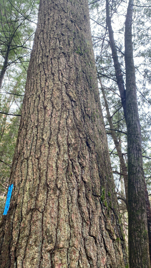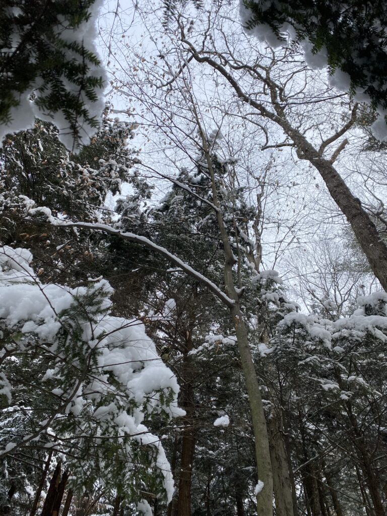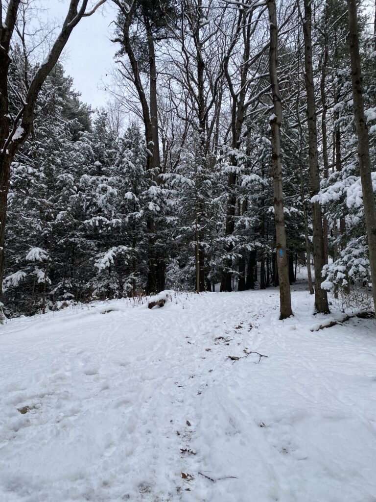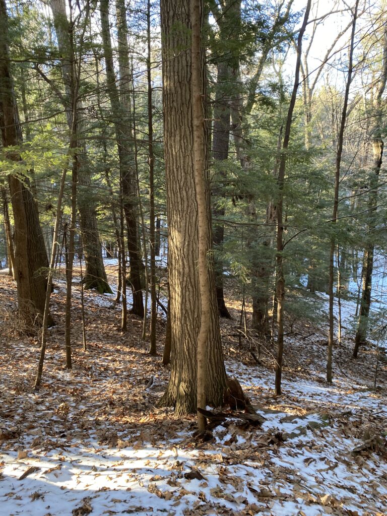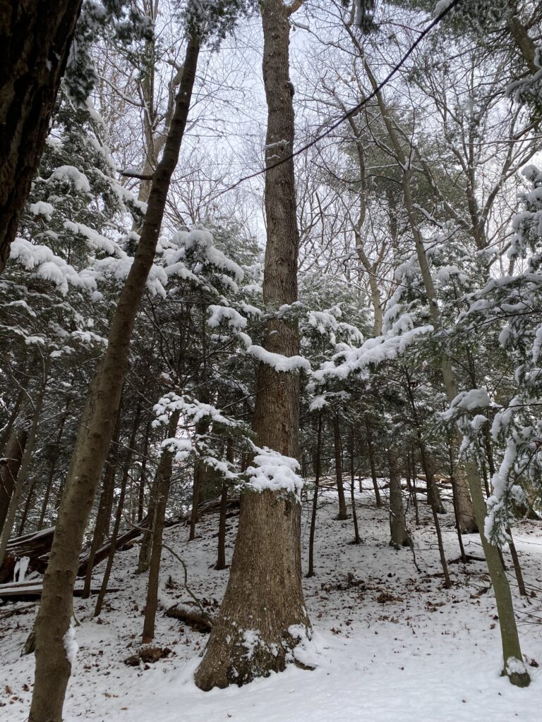 Upon return to my spot, I was greeted with beautiful snow covered boughs and pristine snow immediately off the trails. Walking to my spot I saw a number of people walking the trails, enjoying the snow. It was incredibly peaceful at my spot, the air quiet, with the only audible sounds being overladen branches occasionally dumping snow onto the ground. The only green remaining at my site is that of the numerous Eastern hemlock that encircle the now barren red oak. An American beech still clings to a couple of dead leaves in its crown; the fallen leaves resting under the pristine blanket of snow.